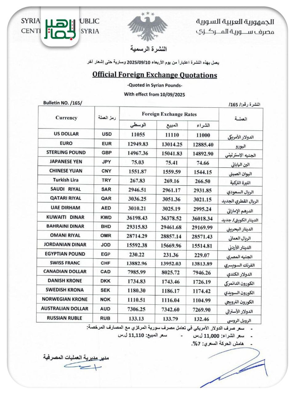 سعر صرف الليرة السورية مقابل العملات الأجنبية والعربية بحسب النشرة الرسمية من مصرف سورية المركزي بتاريخ 10/ 09/ 2025 اقتصاد On سبتمبر 10, 2025 Share #صحيفة_الجماهير Share FacebookTwitterGoogle+ReddItWhatsAppPinterestالبريد الإلكتروني