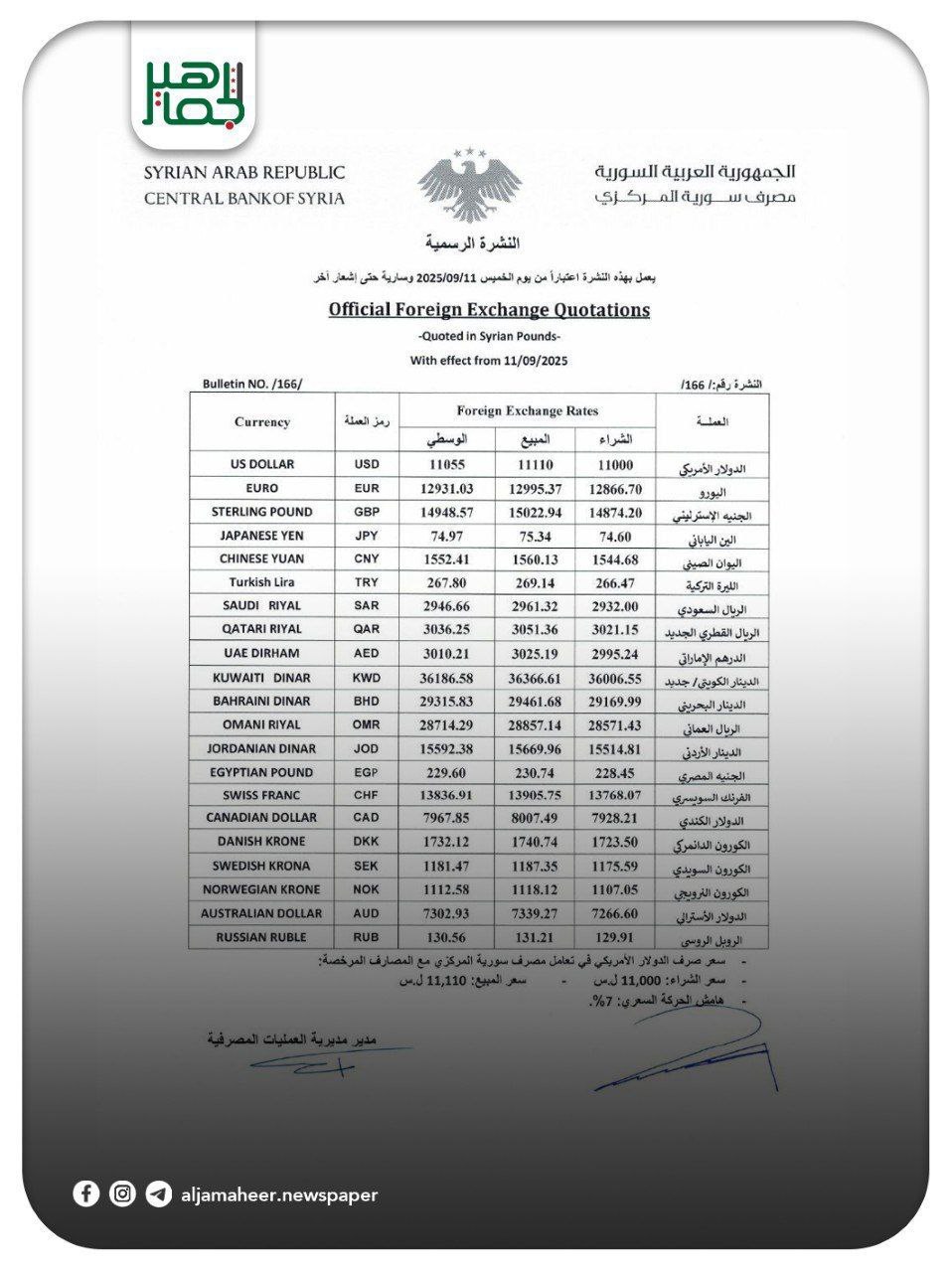 سعر صرف الليرة السورية مقابل العملات الأجنبية والعربية بحسب النشرة الرسمية من مصرف سورية المركزي بتاريخ 11/ 09/ 2025 اقتصاد On سبتمبر 11, 2025 Share #صحيفة_الجماهير Share FacebookTwitterGoogle+ReddItWhatsAppPinterestالبريد الإلكتروني