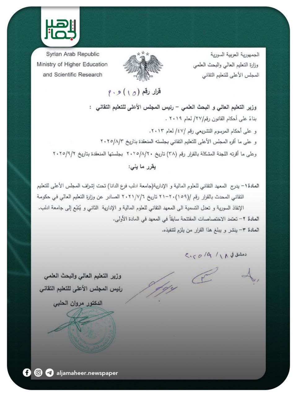اعتماد المعهد التقاني للعلوم المالية والإدارية فرع الدانا التابع لجامعة إدلب، تحت إشراف المجلس الأعلى للتعليم التقاني شباب وجامعات On سبتمبر 18, 2025 Share Share FacebookTwitterGoogle+ReddItWhatsAppPinterestالبريد الإلكتروني