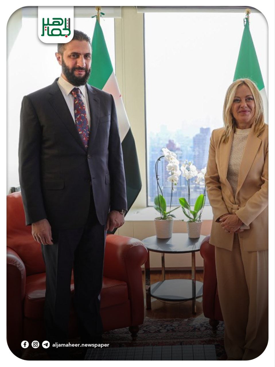 رئاسة الجمهورية: السيد الرئيس #أحمد_الشرع يجتمع مع رئيسة وزراء إيطاليا جورجيا ميلوني، في مقر البعثة الإيطالية بنيويورك، بحضور وزير الخارجية أسعد الشيباني، والوفد المرافق، وذلك خلال مشاركة السيد الرئيس في أعمال الدورة الثمانين للجمعية العامة للأمم المتحدة.