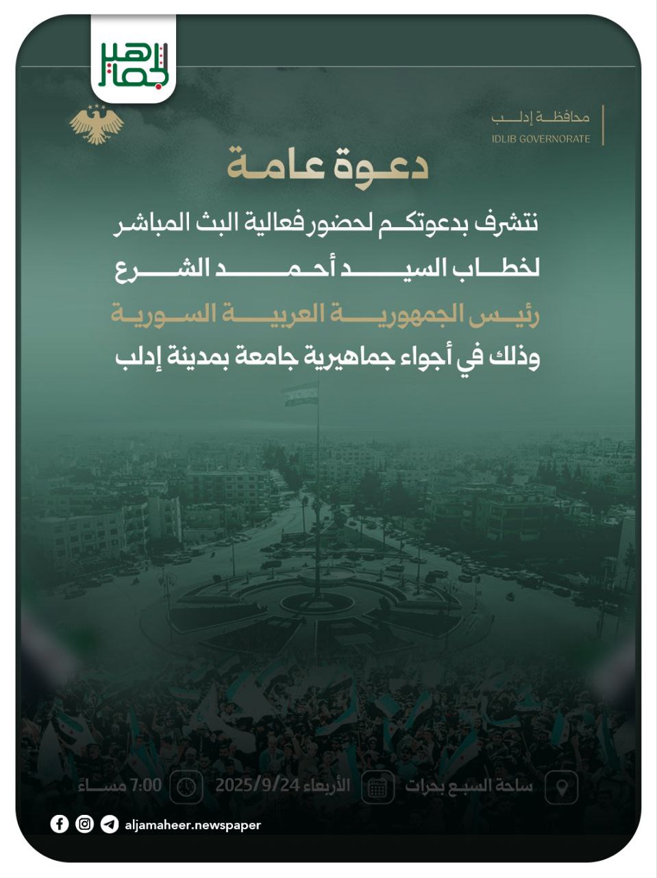 محافظة إدلب توجه دعوة عامة لحضور فعالية البث المباشر لخطابة السيد الرئيس #أحمد_الشرع رئيس الجمهورية العربية السورية وذلك في أجواء جماهيرية جامعة في ساحة السبع بحرات بمدينة إدلب. أحدث الأخبار On سبتمبر 24, 2025 Share Share FacebookTwitterGoogle+ReddItWhatsAppPinterestالبريد الإلكتروني