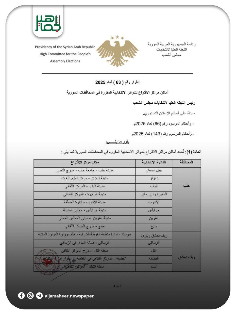 اللجنة العليا لانتخابات مجلس الشعب تصدر القرار رقم (63) لعام 2025 القاضي بتحديد أماكن مراكز الاقتراع للدوائر الانتخابية المقررة في المحافظات السورية. أحدث الأخبار On أكتوبر 2, 2025 Share Share FacebookTwitterGoogle+ReddItWhatsAppPinterestالبريد الإلكتروني