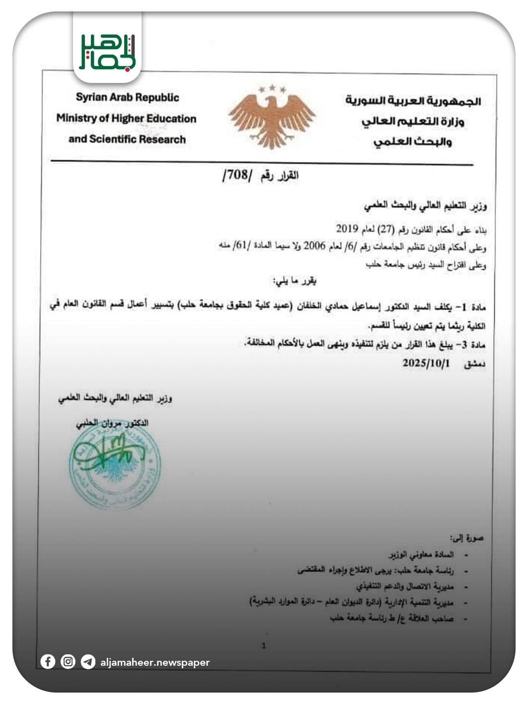 بعد التأكد من ارتباطه بالنظام المخلوع، والترويج لدعايته في وقت سابق، عبر الإساءة للسوريين الذين انتفضوا في وجه النظام البائد عزل رئيس قسم "القانون العام" في كلية الحقوق بجامعة حلب عصام شهابي، من منصبه، وتعيين عميد الكلية إسماعيل الخلفان بتسيير أعمال القسم خدمي On أكتوبر 2, 2025 Share Share FacebookTwitterGoogle+ReddItWhatsAppPinterestالبريد الإلكتروني