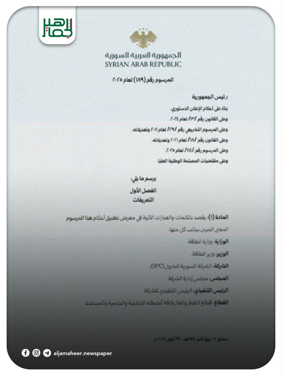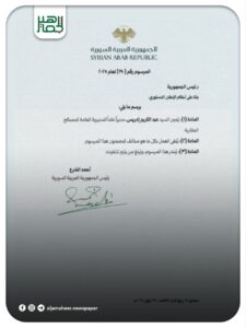 الرئيس #أحمد_الشرع يصدر مرسوماً يقضي بإحداث “الشركة السورية للبترول SPC” ومقرها دمشق. أحدث الأخبار On أكتوبر 2, 2025 Share Share FacebookTwitterGoogle+ReddItWhatsAppPinterestالبريد الإلكتروني