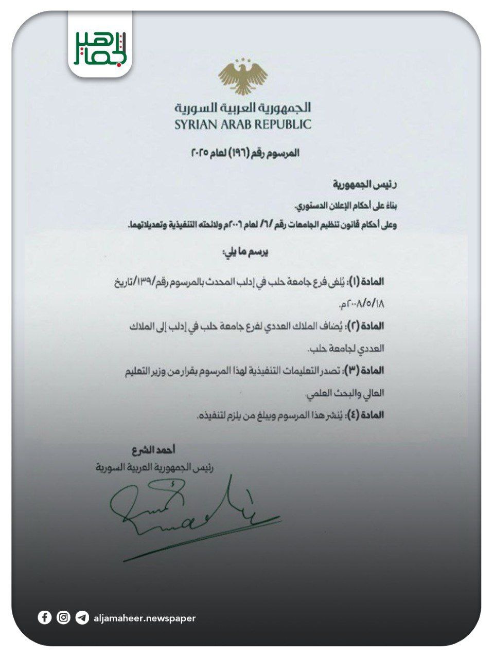 مرسوم رئاسي رقم (196) لعام 2025 م، يقضي بإلغاء فرع جامعة حلب في إدلب المحدث بالمرسوم رقم (139) تاريخ 18-5-2008م. أحدث الأخبارمحليات On أكتوبر 2, 2025 Share Share FacebookTwitterGoogle+ReddItWhatsAppPinterestالبريد الإلكتروني