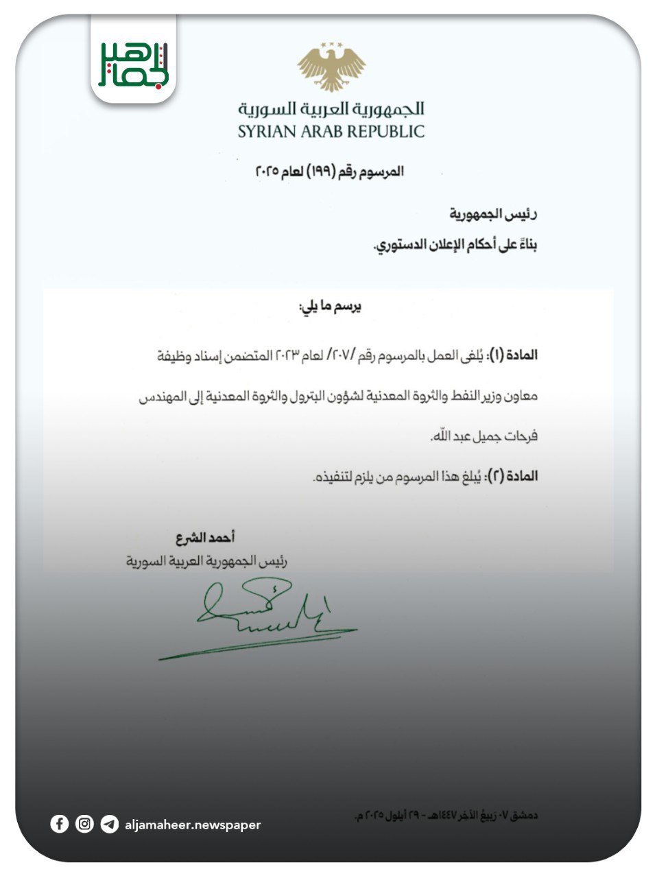 مرسوم رئاسي بإلغاء إسناد وظيفة معاون وزير النفط إلى فرحات عبد الله. محليات On أكتوبر 3, 2025 Share #صحيفة_الجماهير Share FacebookTwitterGoogle+ReddItWhatsAppPinterestالبريد الإلكتروني