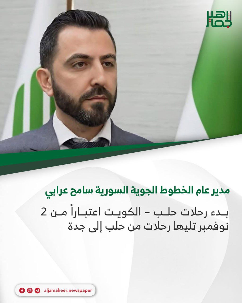 مدير عام الخطوط الجوية السورية سامح عرابي عبر منصة “X”: 📌 بدء رحلات حلب – الكويت اعتباراً من 2 نوفمبر تليها رحلات من حلب إلى جدة 📌 هذه البداية فقط.. المزيد من الوجهات من حلب قريباً إن شاء الله خدمي On أكتوبر 3, 2025 Share Share FacebookTwitterGoogle+ReddItWhatsAppPinterestالبريد الإلكتروني