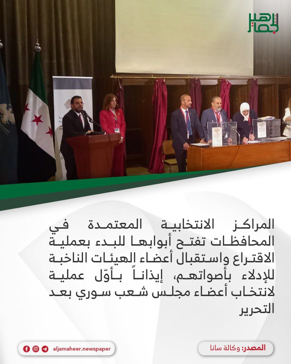 سانا: المراكز الانتخابية المعتمدة في المحافظات تفتح أبوابها للبدء بعملية الاقتراع واستقبال أعضاء الهيئات الناخبة للإدلاء بأصواتهم، إيذاناً بأوّل عملية لانتخاب أعضاء مجلس شعب سوري بعد التحرير. خدمي On أكتوبر 5, 2025 Share #صحيفة_الجماهير Share FacebookTwitterGoogle+ReddItWhatsAppPinterestالبريد الإلكتروني