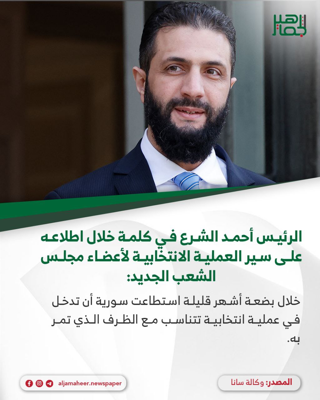 الرئيس أحمد الشرع في كلمة خلال اطلاعه على سير العملية الانتخابية لأعضاء مجلس الشعب الجديد في مركز المكتبة الوطنية لدائرة دمشق الانتخابية: