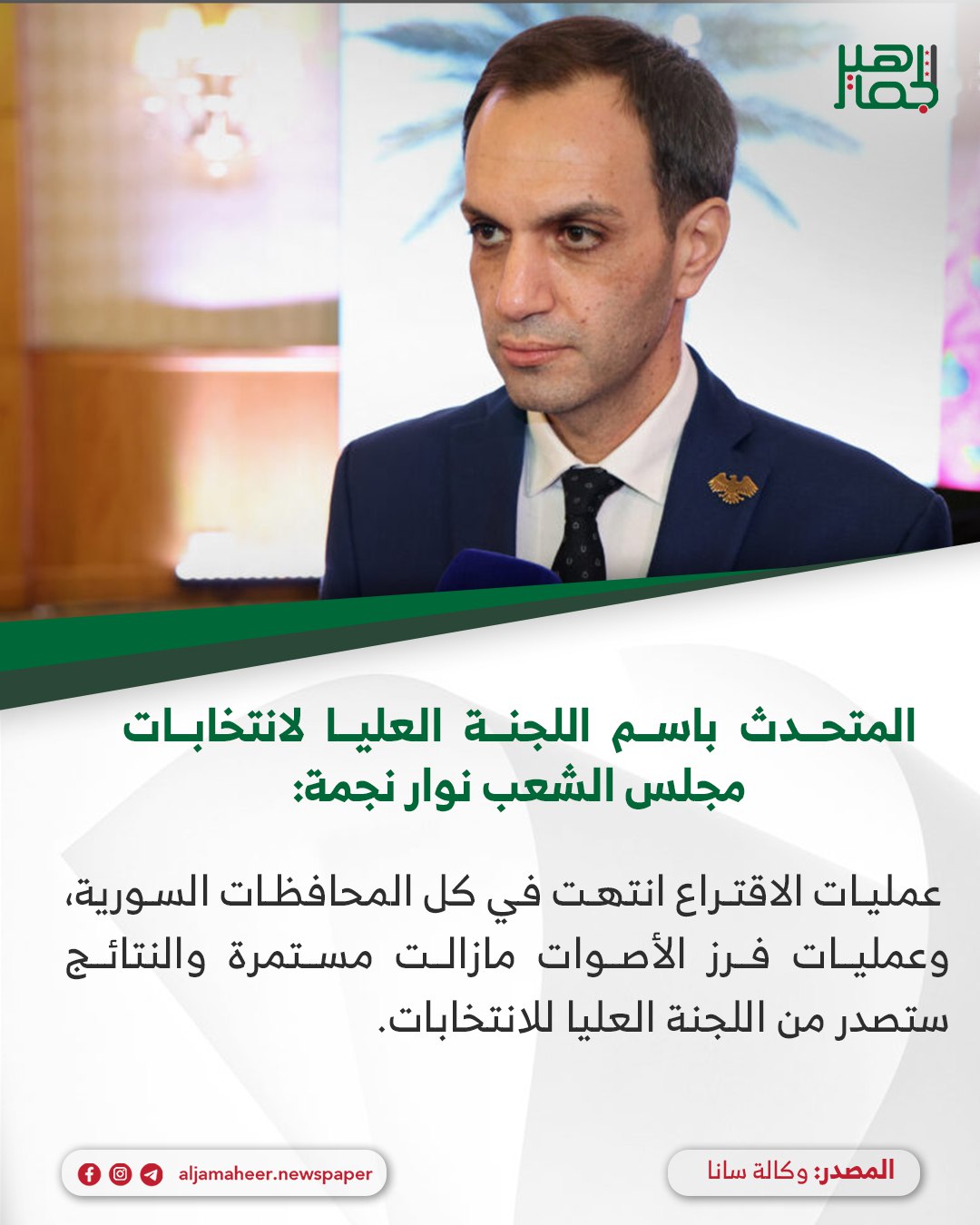 المتحدث باسم اللجنة العليا لانتخابات مجلس الشعب نوار نجمة لـ سانا: عمليات الاقتراع انتهت في كل المحافظات السورية، وعمليات فرز الأصوات مازالت مستمرة والنتائج ستصدر من اللجنة العليا للانتخابات خدمي On أكتوبر 5, 2025 Share Share FacebookTwitterGoogle+ReddItWhatsAppPinterestالبريد الإلكتروني