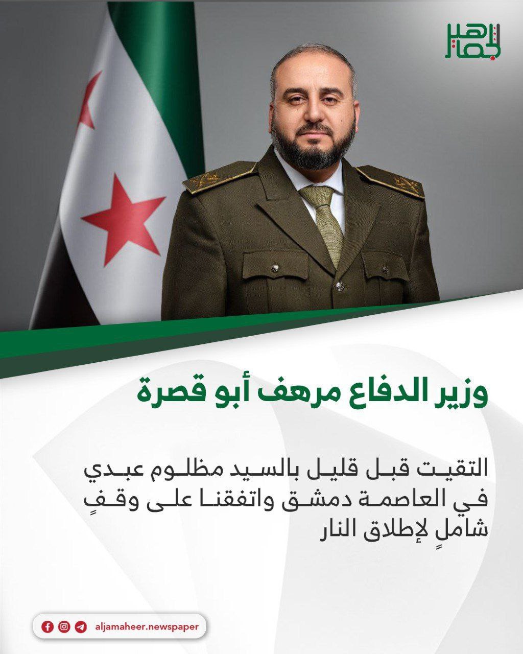 وزير الدفاع مرهف أبو قصرة عبر حسابه الرسمي على منصة “X” أحدث الأخبار On أكتوبر 7, 2025 Share التقيت قبل قليل بالسيد مظلوم عبدي في العاصمة دمشق واتفقنا على وقفٍ شاملٍ لإطلاق النار بكافة المحاور ونقاط الانتشار العسكرية شمال وشمال شرق سورية، على أن يبدأ تنفيذ هذا الاتفاق فورياً. 🔔 اشترك بقناة التيليجرام: https://t.me/jamaheer Share FacebookTwitterGoogle+ReddItWhatsAppPinterestالبريد الإلكتروني