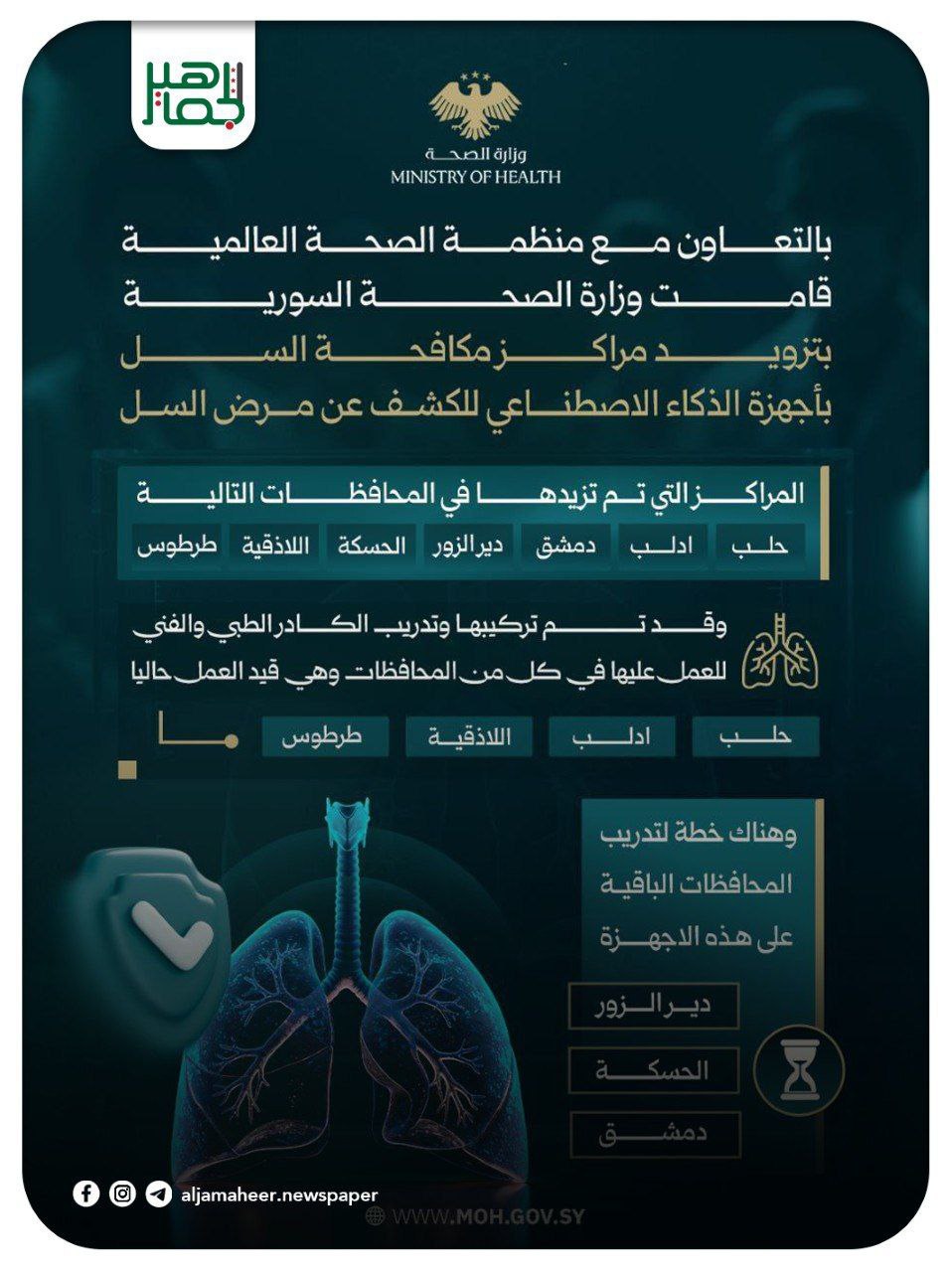 📌بالتعاون مع منظمة الصحة العالمية زودت وزارة الصحة السورية مراكز مكافحة السل في المحافظات التالية ( إدلب – حلب – دمشق – دير الزور – الحسكة – اللاذقية – طرطوس ) بأجهزة الذكاء الاصطناعي للكشف عن مرض السل.