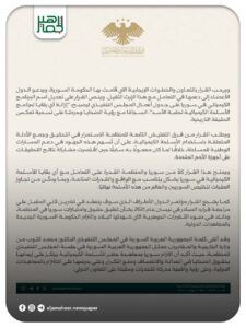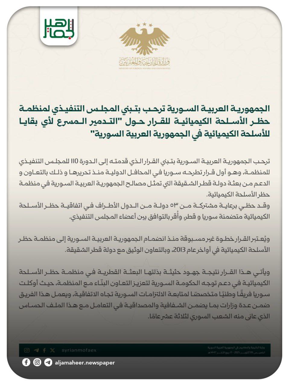 وزارة الخارجية: الجمهورية العربية السورية ترحب بتبني المجلس التنفيذي لمنظمة حظر الأسلحة الكيميائية للقرار حول “التدمير المسرع لأي بقايا للأسلحة الكيميائية في الجمهورية العربية السورية”. أحدث الأخبار On أكتوبر 9, 2025 Share Share FacebookTwitterGoogle+ReddItWhatsAppPinterestالبريد الإلكتروني