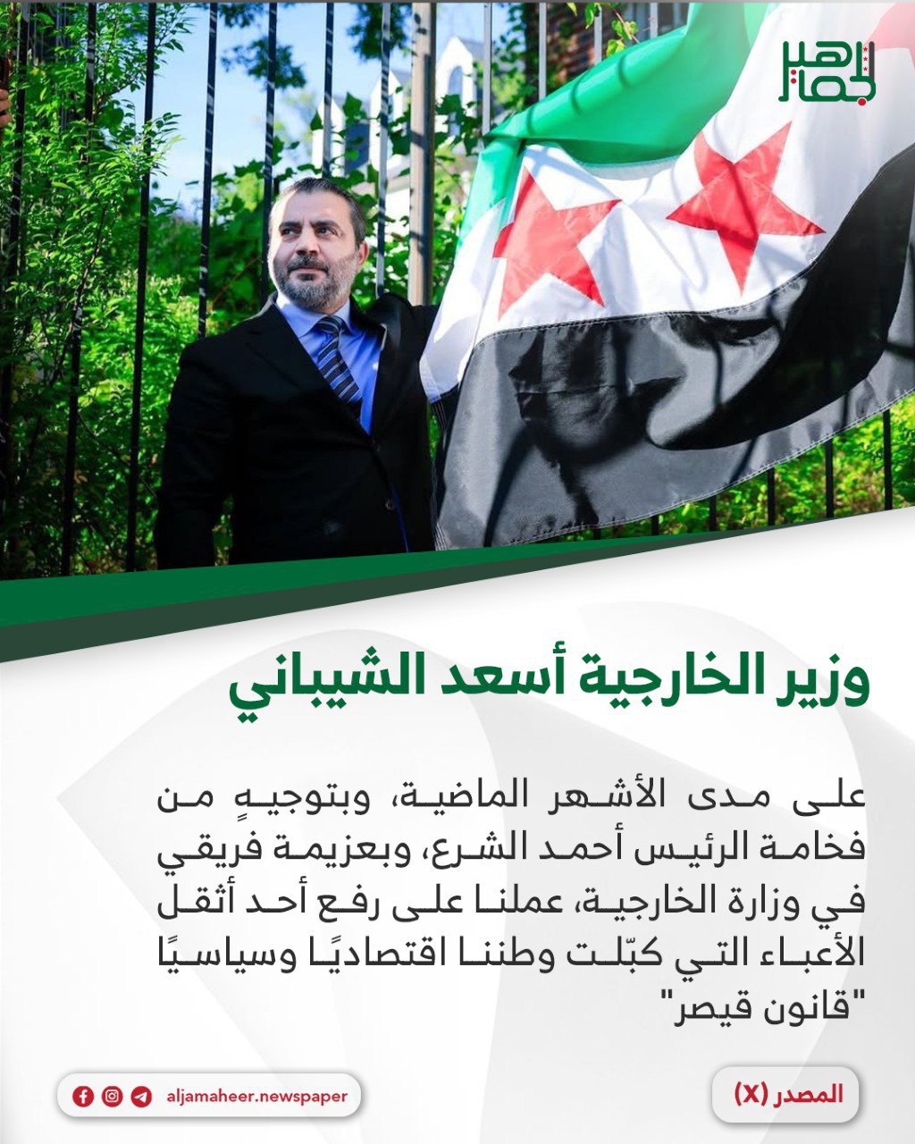 على مدى الأشهر الماضية، وبتوجيهٍ من فخامة الرئيس أحمد الشرع، وبعزيمة فريقي في وزارة الخارجية، عملنا على رفع أحد أثقل الأعباء التي كبّلت وطننا اقتصادياً وسياسياً “قانون قيصر”.