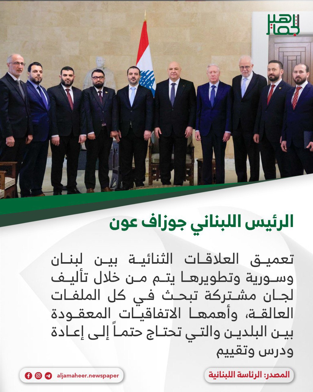 📌تعميق العلاقات الثنائية بين لبنان وسورية وتطويرها يتم من خلال تأليف لجان مشتركة تبحث في كل الملفات العالقة، وأهمها الاتفاقيات المعقودة بين البلدين والتي تحتاج حتما إلى إعادة ودرس وتقييم.