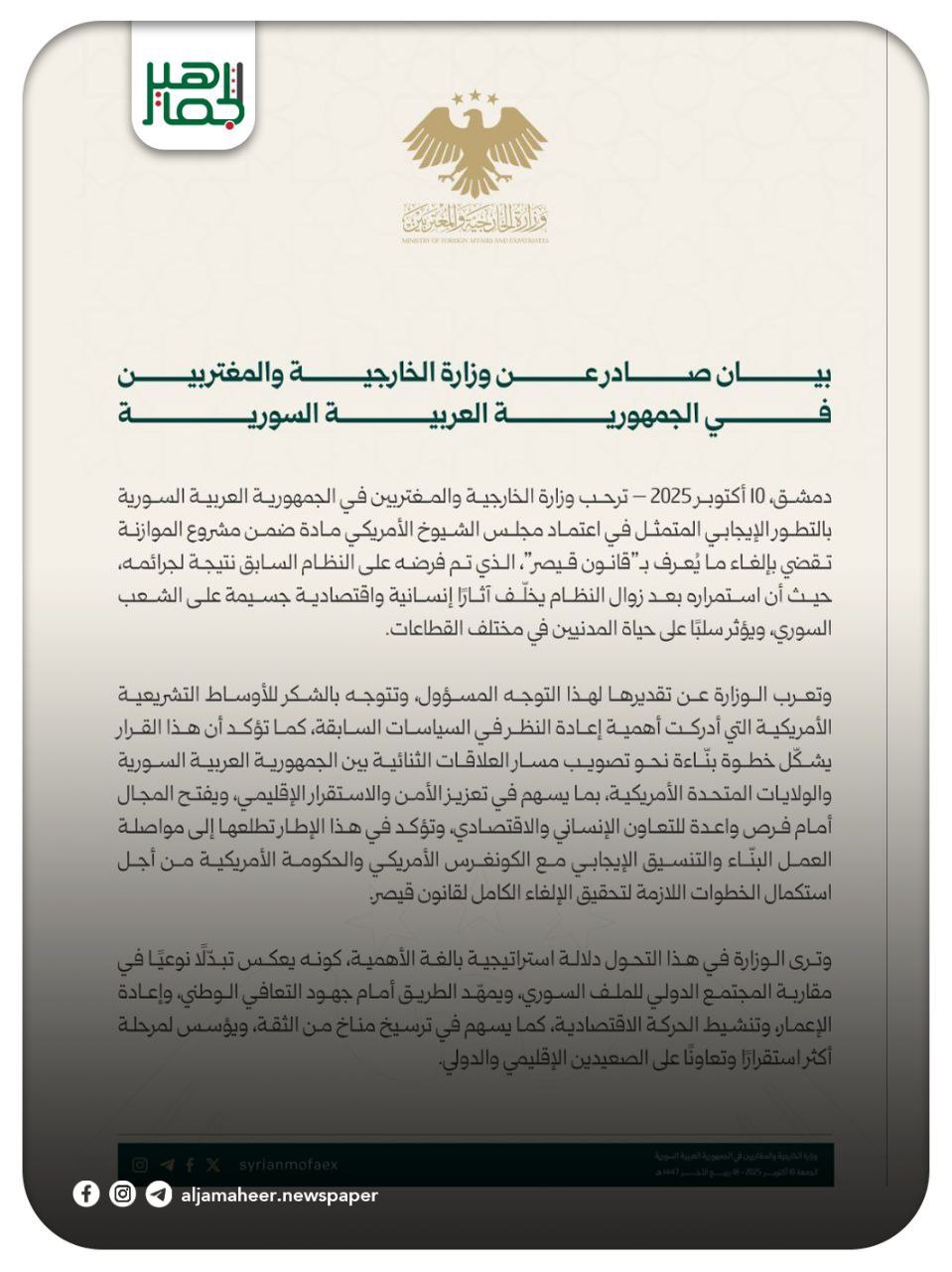 ترحب وزارة الخارجية والمغتربين في سورية باعتماد مجلس الشيوخ الأمريكي مادة ضمن مشروع الموازنة تقضي بإلغاء ما يعرف بـقانون قيصر الذي تم فرضه على النظام السابق نتيجة جرائمه أحدث الأخبار On أكتوبر 10, 2025 Share Share FacebookTwitterGoogle+ReddItWhatsAppPinterestالبريد الإلكتروني