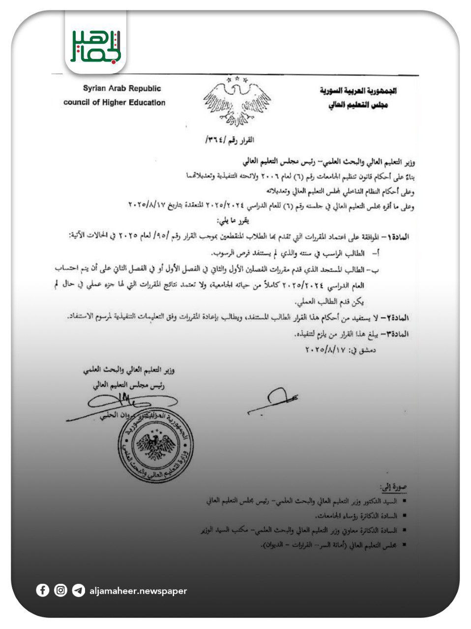 مجلس التعليم العالي يصدر القرار القاضي بالموافقة على اعتماد المقررات التي تقدم بها الطلاب المنقطعين وفق الموضح في القرار. أحدث الأخبار On أكتوبر 12, 2025 Share Share FacebookTwitterGoogle+ReddItWhatsAppPinterestالبريد الإلكتروني