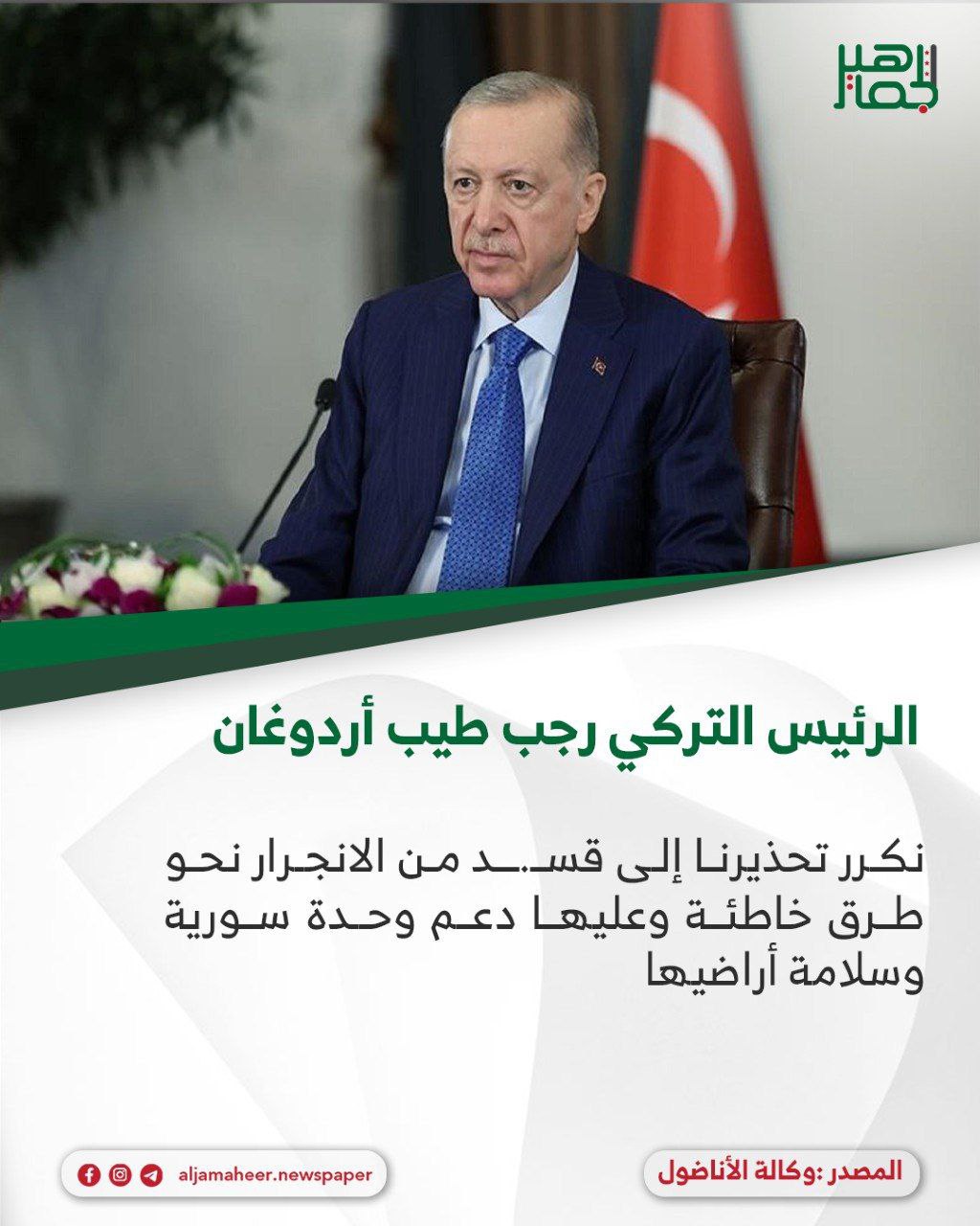 الأناضول عن الرئيس التركي رجب طيب أردوغان: خدمي On أكتوبر 14, 2025 Share اندماج قســ.ــد مع سورية في أقرب وقت سيسرّع خطوات التنمية بالبلاد. نكرر تحذيرنا إلى قــ.ــسد من الانجرار نحو طرق خاطئة وعليها دعم وحدة سورية وسلامة أراضيها. #صحيفة_الجماهير Share FacebookTwitterGoogle+ReddItWhatsAppPinterestالبريد الإلكتروني