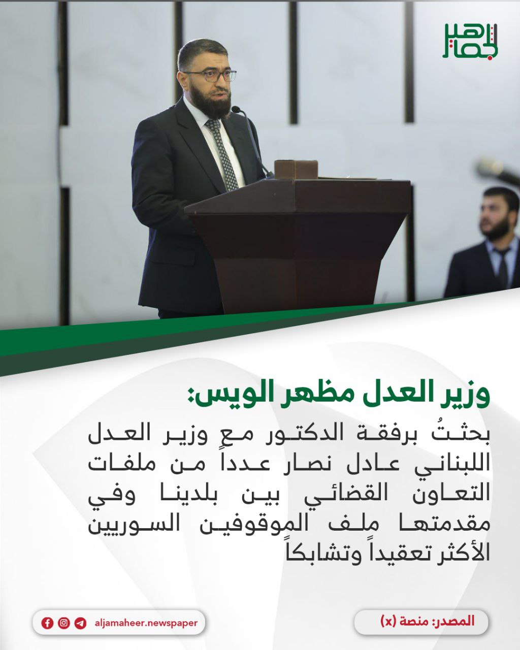 بحثتُ برفقة الدكتور محمد الأحمد مدير إدارة الشؤون العربية في وزارة الخارجية وعدد من السادة القضاة مع معالي وزير العدل اللبناني الأستاذ عادل نصار عدداً من ملفات التعاون القضائي بين بلدينا وفي مقدمتها ملف الموقوفين السوريين الذي يُعد من أكثر الملفات تعقيداً وتشابكاً