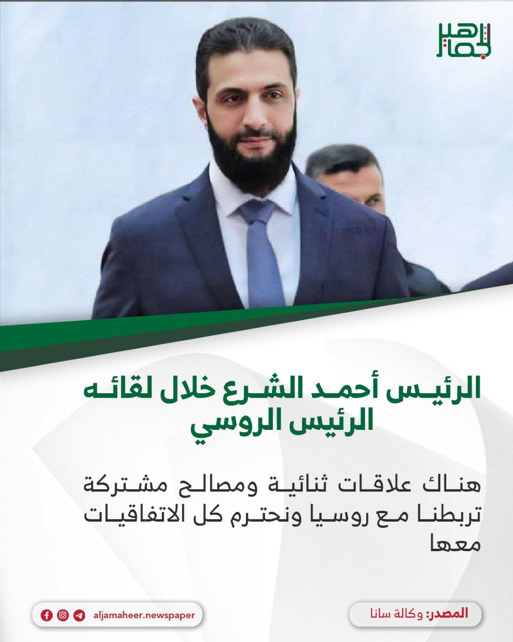 الرئيس أحمد الشرع خلال لقائه الرئيس الروسي فلاديمير بوتين في موسكو أحدث الأخبار On أكتوبر 15, 2025 Share 📌 نحن في سورية الجديدة نعيد ربط العلاقات مع كل الدول الإقليمية والعالمية، وهناك علاقات ثنائية ومصالح مشتركة تربطنا مع روسيا ونحترم كل الاتفاقيات معها. 📌 لدينا علاقات وثيقة مع روسيا وجزء كبير من قطاع الطاقة في سورية يعتمد على الخبرات الروسية. Share FacebookTwitterGoogle+ReddItWhatsAppPinterestالبريد الإلكتروني