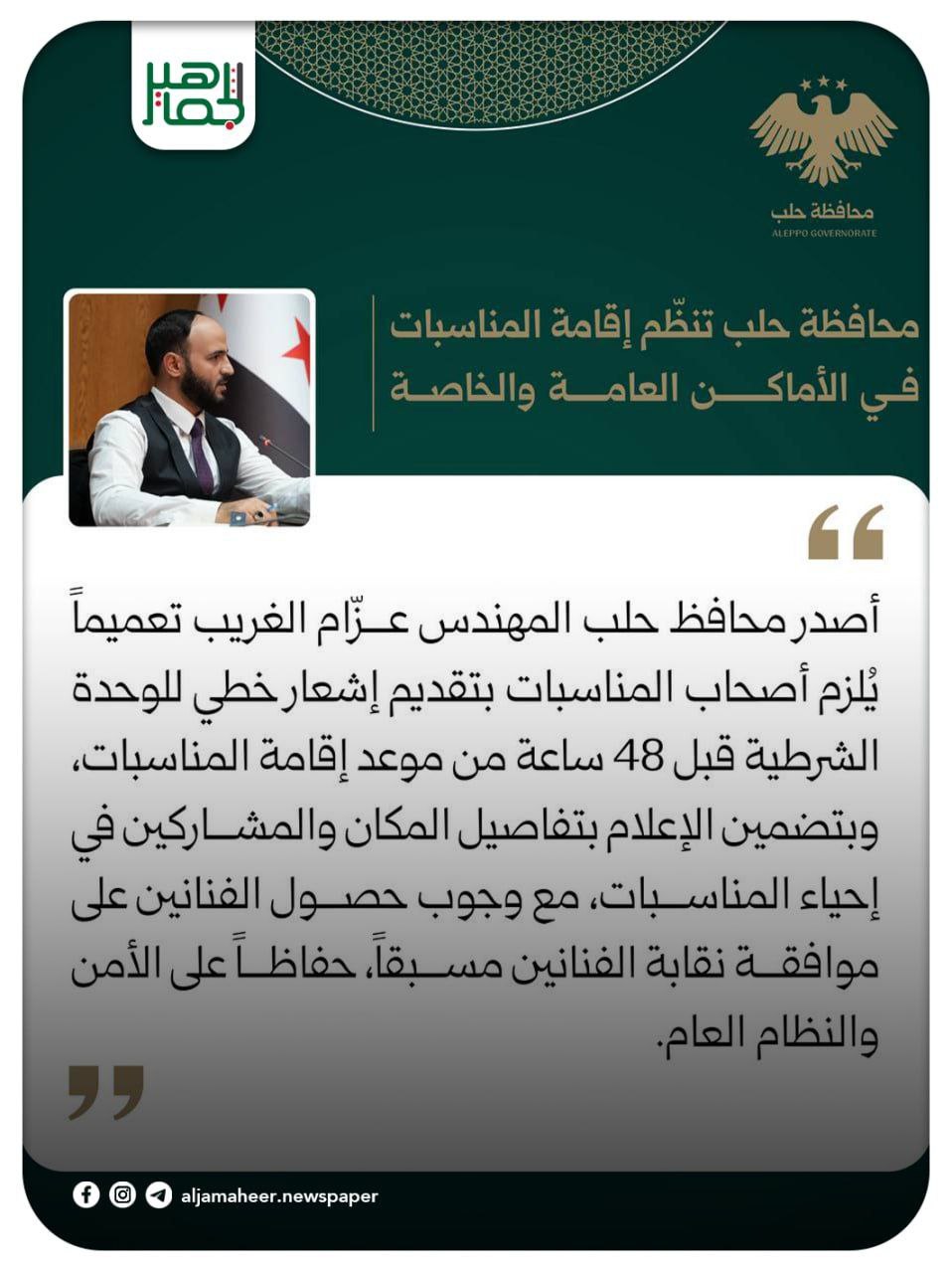 محافظة حلب تنظم إقامة المناسبات في الأماكن العامة والخاصة أحدث الأخبارخدمي On أكتوبر 15, 2025 Share Share FacebookTwitterGoogle+ReddItWhatsAppPinterestالبريد الإلكتروني
