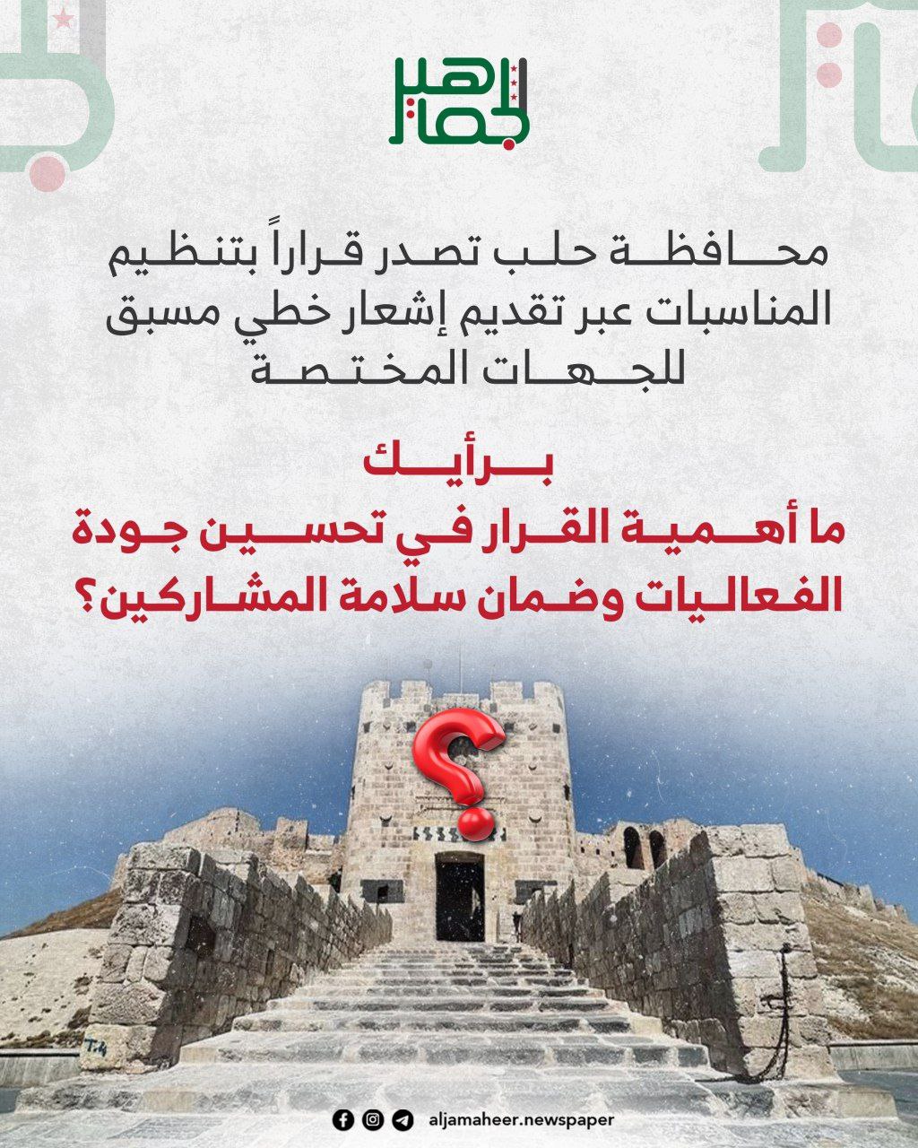 بعد صدور تعميم محافظة حلب بإلزام أصحاب المناسبات تقديم إشعار خطي مسبق للجهات المختصة. برأيك ما أهمية القرار في تحسين جودة الفعاليات وضمان سلامة المشاركين؟ أحدث الأخبارخدمي On أكتوبر 15, 2025 Share Share FacebookTwitterGoogle+ReddItWhatsAppPinterestالبريد الإلكتروني