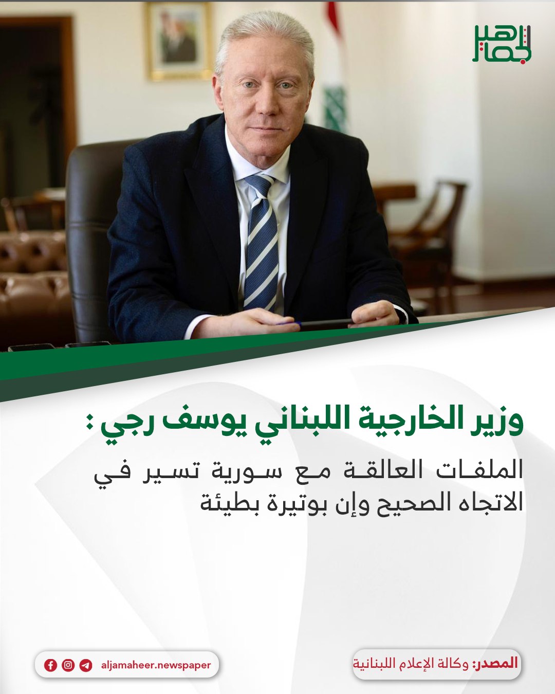 وزير الخارجية اللبناني يوسف رجي خلال استقباله لوفد من جمعية “إعلاميون من أجل الحرية”: أحدث الأخبار On أكتوبر 16, 2025 Share صفحة جديدة فتحت مع سورية مبنية على الاحترام المتبادل للسيادة وعدم التدخل بالشؤون الداخلية الملفات العالقة مع سورية تسير في الاتجاه الصحيح وإن بوتيرة بطيئة اشترك بقناة التيليجرام: https://t.me/jamaheer Share FacebookTwitterGoogle+ReddItWhatsAppPinterestالبريد الإلكتروني