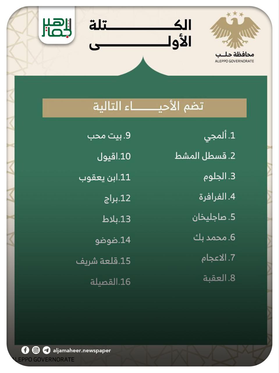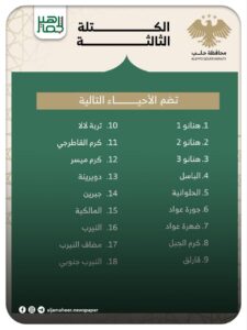 حرصاً على تعزيز التواصل المجتمعي وتسريع الاستجابة لتلبية الاحتياجات الخدمية للمواطنين، محافظ حلب يقسم مدينة حلب إلى خمس كتل إدارية.