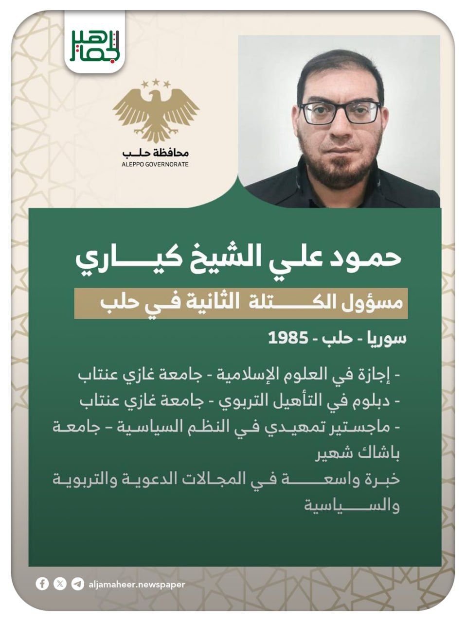 محافظ حلب يعيّن حمود علي الشيخ كياري مسؤولاً عن الكتلة الثانية في مدينة حلب. أحدث الأخبارخدمي On أكتوبر 17, 2025 Share Share FacebookTwitterGoogle+ReddItWhatsAppPinterestالبريد الإلكتروني