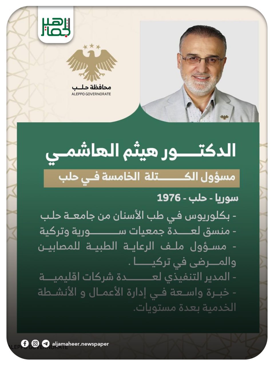 محافظ حلب يعيّن هيثم الهاشمي مسؤولاً عن الكتلة الخامسة في مدينة حلب. خدمي On أكتوبر 17, 2025 Share #صحيفة_الجماهير Share FacebookTwitterGoogle+ReddItWhatsAppPinterestالبريد الإلكتروني