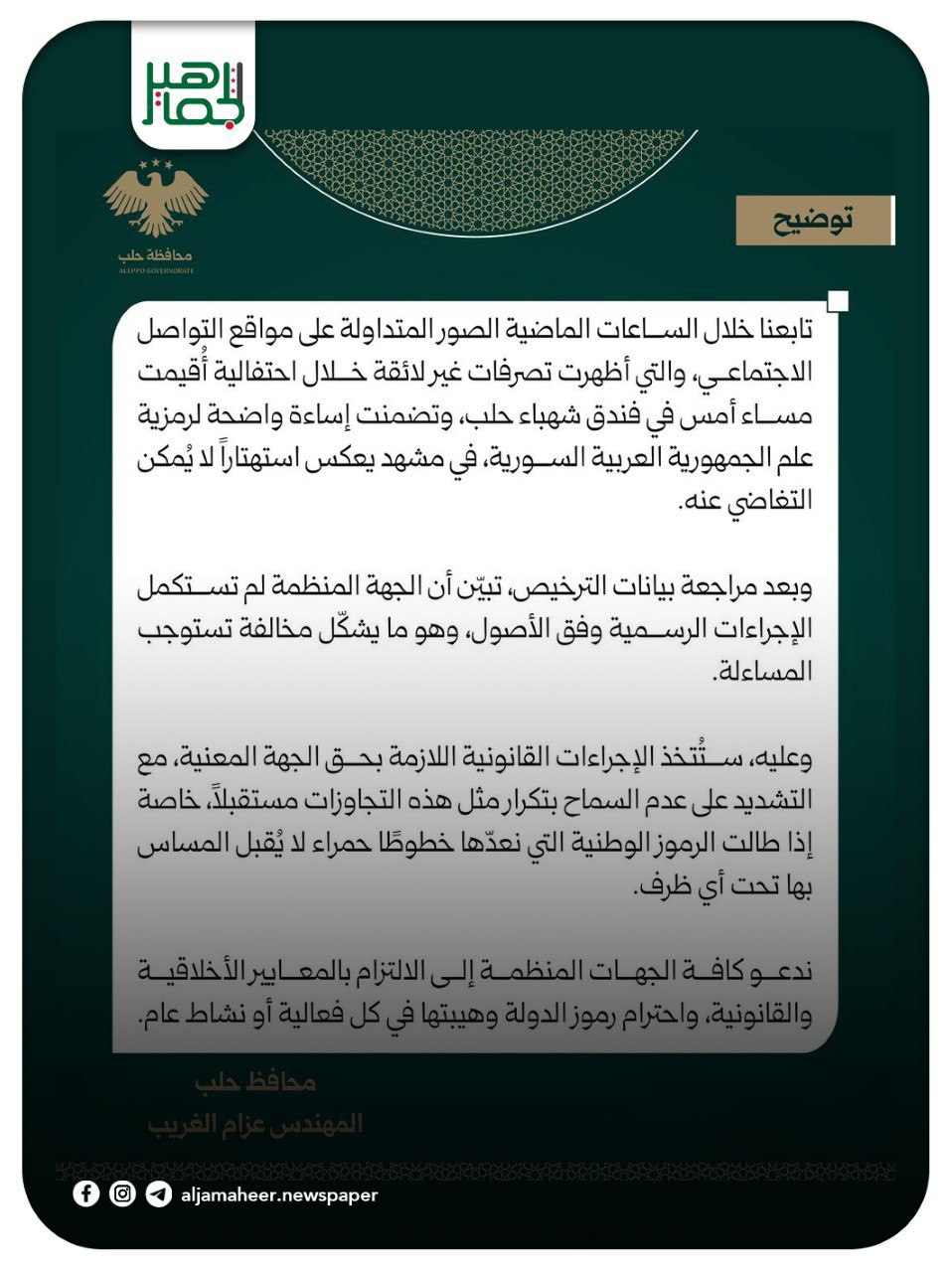 توضيح محافظ حلب المهندس عزام الغريب حول ما حدث في فندق شهباء حلب. خدمي On أكتوبر 17, 2025 Share #صحيفة_الجماهير Share FacebookTwitterGoogle+ReddItWhatsAppPinterestالبريد الإلكتروني