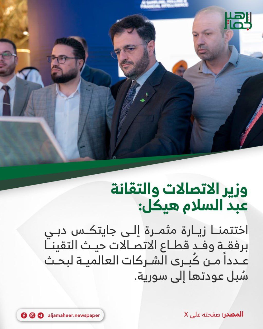 اختتمنا زيارة مثمرة إلى جايتكس دبي برفقة وفد قطاع الاتصالات حيث التقينا عدداً من كُبرى الشركات العالمية لبحث سُبل عودتها إلى سورية