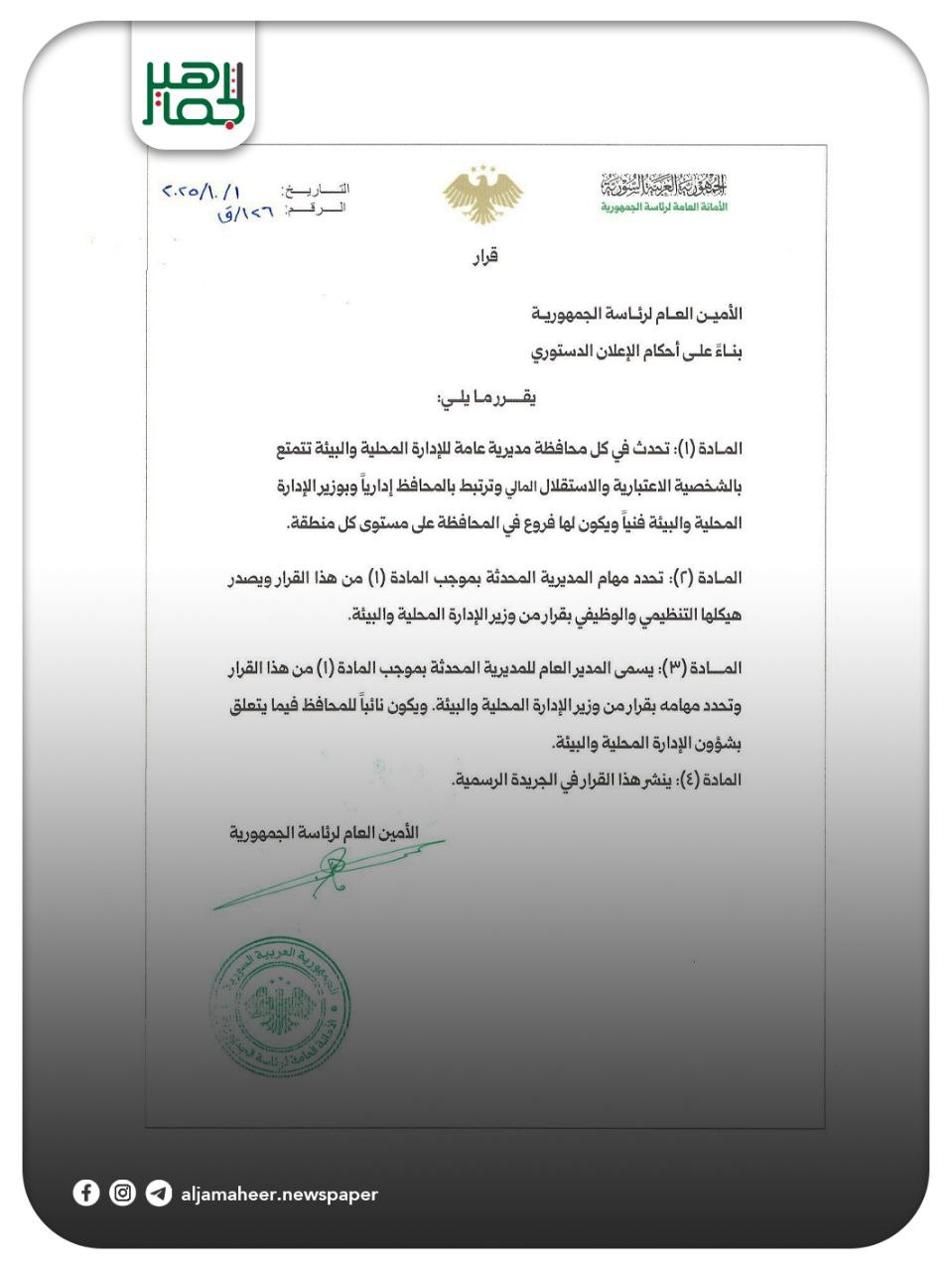 الأمانة العامة لرئاسة الجمهورية: قرار بإحداث مديرية عامة للإدارة المحلية والبيئة في كل محافظة ترتبط فيها إدارياً، فيما ترتبط المديرية بوزارة الإدارة المحلية والبيئة فنياً