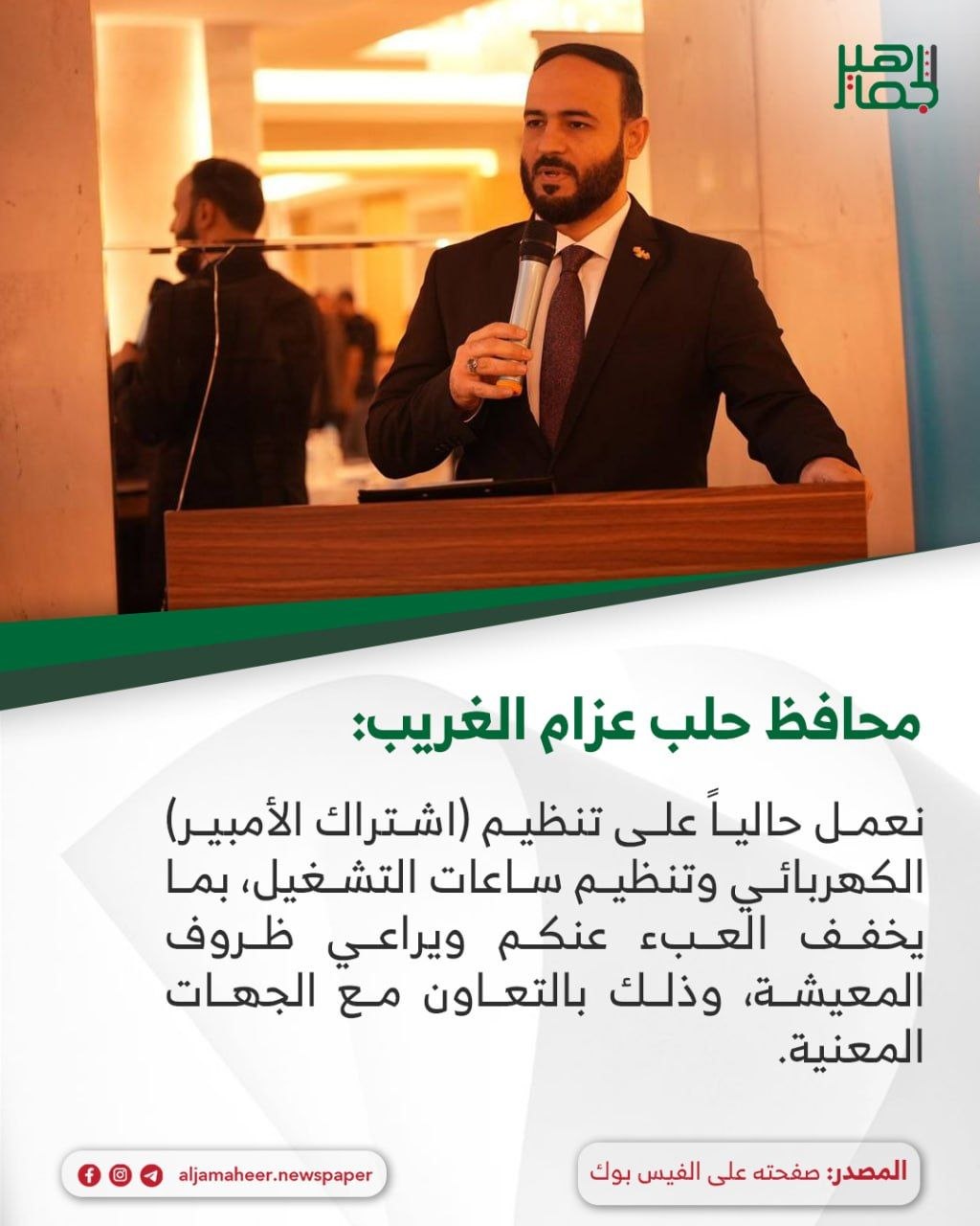 محافظ حلب عزام الغريب عبر “الفيس بوك”: خدمي On أكتوبر 22, 2025 Share نعمل حالياً على تنظيم (اشتراك الأمبير) الكهربائي وتنظيم ساعات التشغيل، بما يخفف العبء عنكم ويراعي ظروف المعيشة، وذلك بالتعاون مع الجهات المعنية. #صحيفة_الجماهير Share FacebookTwitterGoogle+ReddItWhatsAppPinterestالبريد الإلكتروني