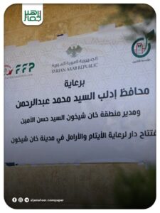 افتتح محافظ إدلب، محمد عبد الرحمن يرافقه مدير المنطقة حسن الأمين داراً لرعاية الأيتام ومشغل خياطة مخصص لإعالة أسر الشهداء في مدينة خان شيخون، وذلك ضمن الجهود المبذولة لدعم الفئات الأكثر احتياجاً وتمكينها اقتصادياً وتعليمياً.