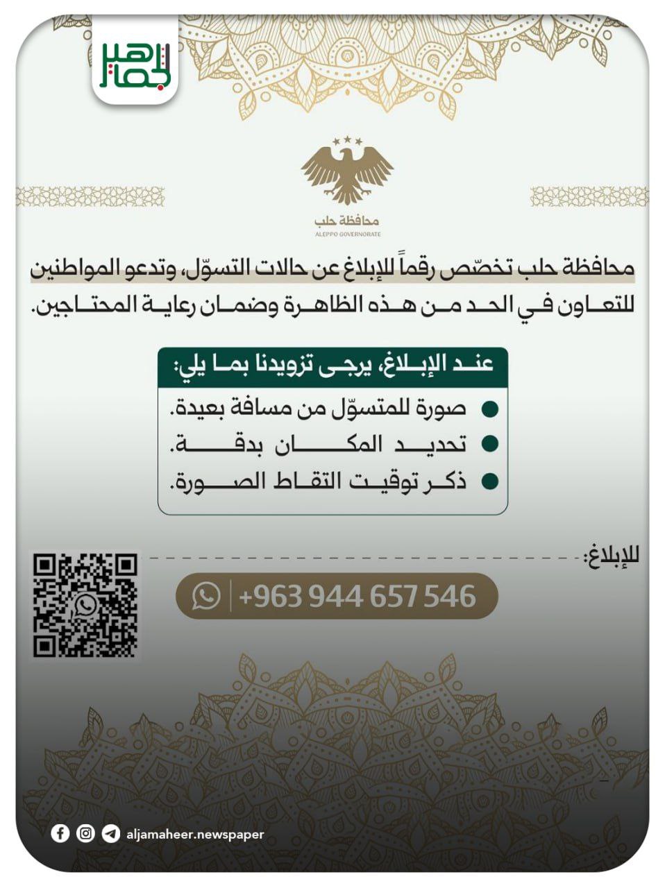 خلال شهرين فقط، تلقت لجنة مكافحة التسوّل في مدينة حلب 842 شكوى من الأهالي، وبعد التدقيق وإزالة التكرار، تم تثبيت 525 حالة فعلية، تم التعامل ميدانيًا مع 411 منها، أي بنسبة استجابة ميدانية بلغت أكثر من 78%📊