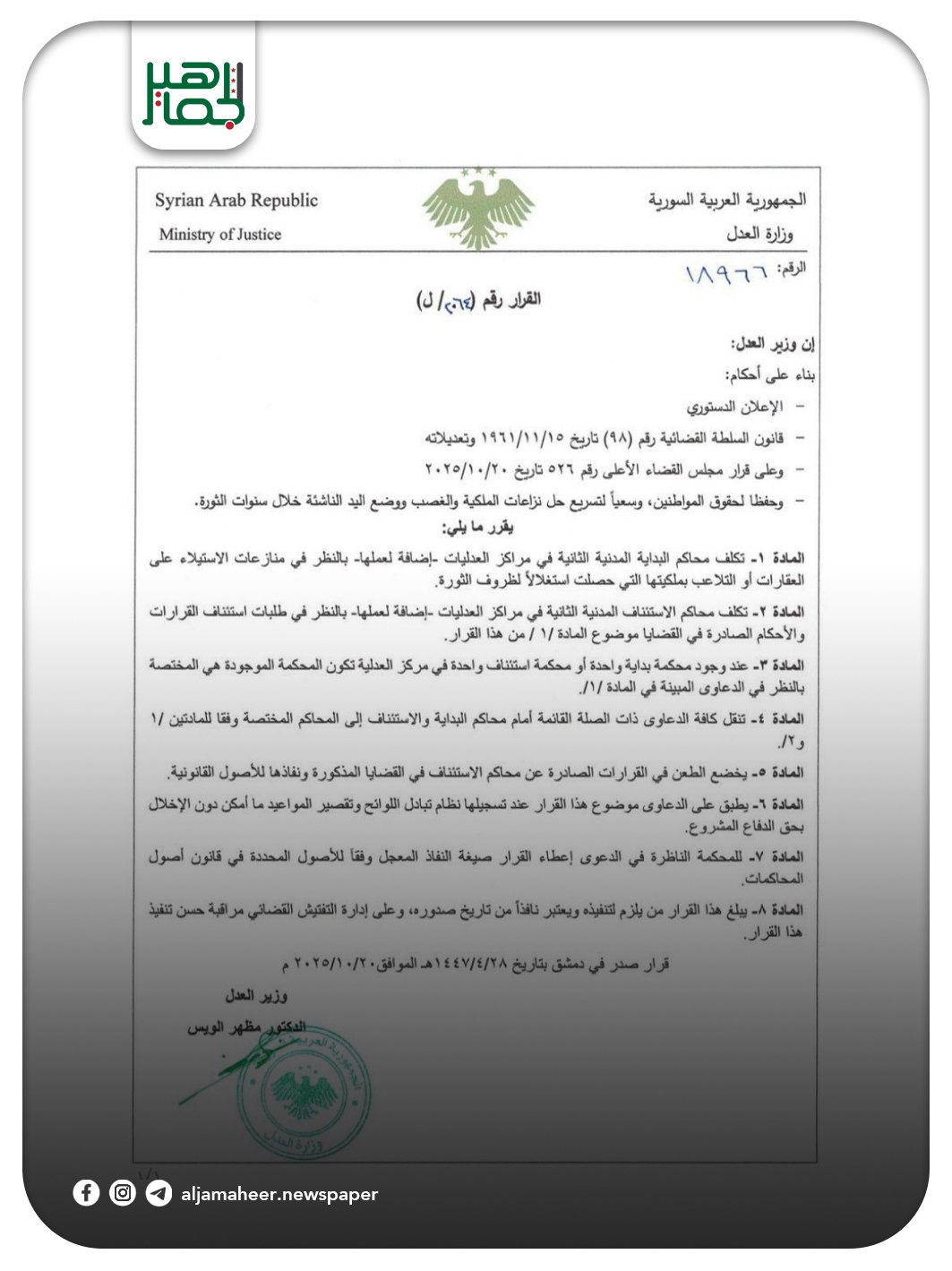 وزارة العدل: قرار بشأن النظر في قضايا الملكية والغصب ووضع اليد الناشئة خلال سنوات الثورة خدمي On أكتوبر 23, 2025 Share Share FacebookTwitterGoogle+ReddItWhatsAppPinterestالبريد الإلكتروني