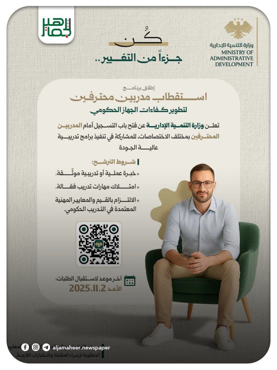 في سياق تنفيذ خارطة التحول المؤسسي وبهدف تعزيز منظومتها التدريبية، تعلن وزارة التنمية الإدارية عن فتح باب التسجيل أمام المدربين المحترفين بمختلف الاختصاصات، للمشاركة في تنفيذ برامج تدريبية عالية الجودة تسهم في تطوير أداء الجهاز الحكومي ورفع كفاءة الموارد البشرية.