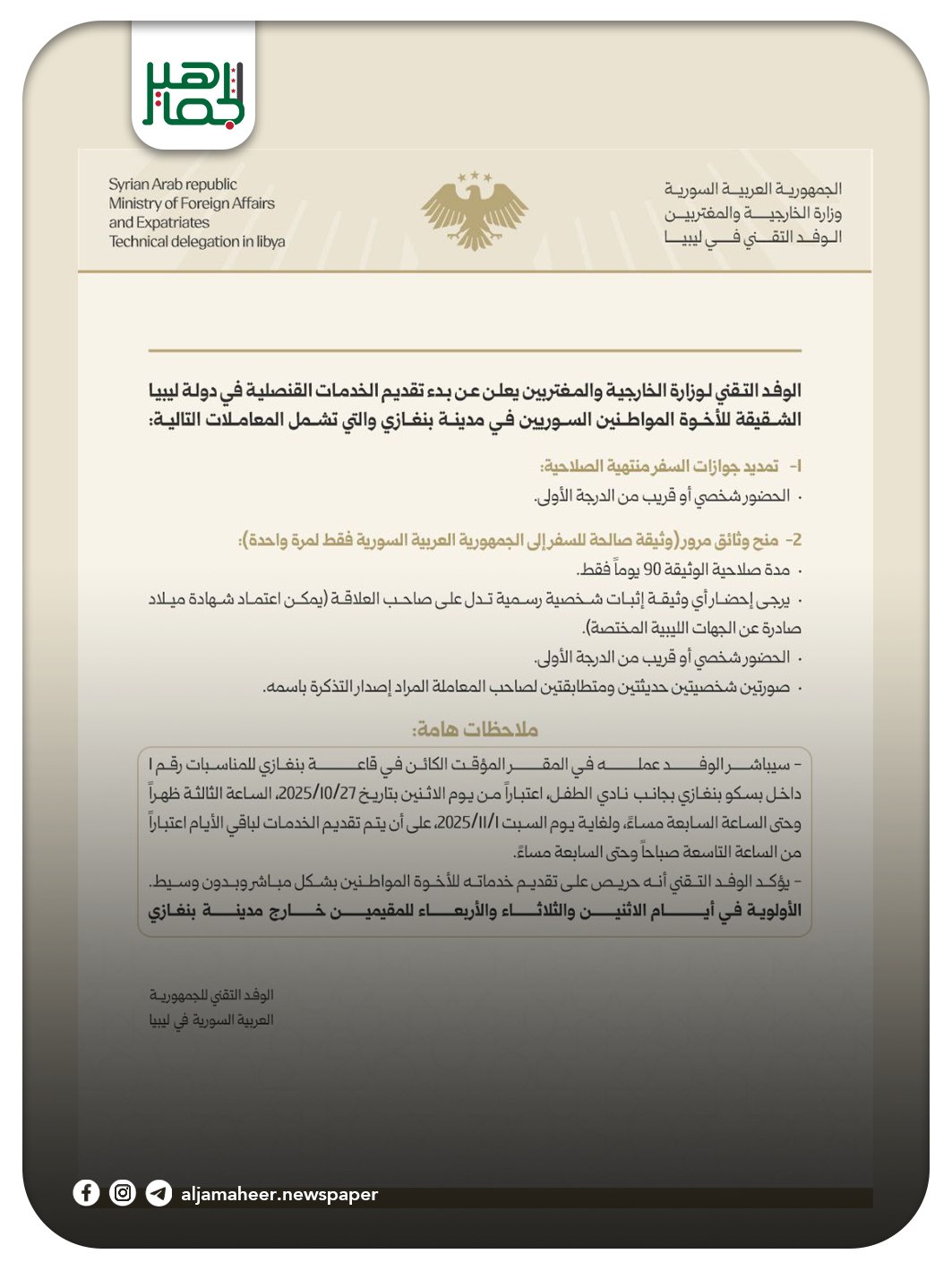 وزارة الخارجية: أحدث الأخبار On أكتوبر 27, 2025 Share الوفد التقني لوزارة الخارجية يعلن عن بدء تقديم الخدمات القنصلية في دولة ليبيا الشـقيقة للأخـوة المواطنين السـوريين فى مدينـة بنغـازي. اشترك بقناة التيليجرام: https://t.me/jamaheer Share FacebookTwitterGoogle+ReddItWhatsAppPinterestالبريد الإلكتروني