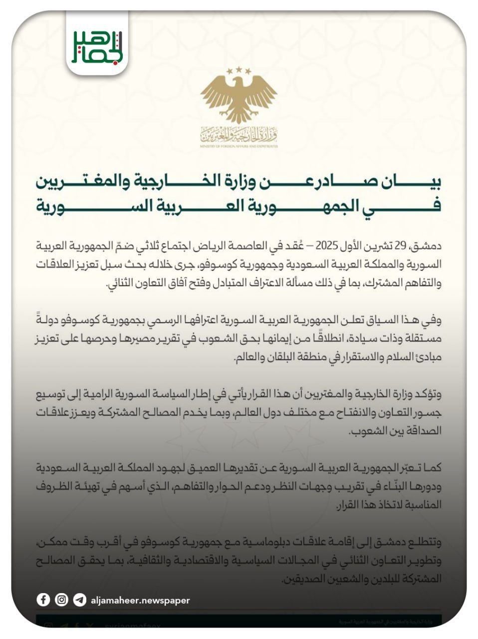 بيان صادر عن وزارة الخارجية والمغتربين في الجمهورية العربية السورية حول الاعتراف الرسمي بجمهورية كوسوفو