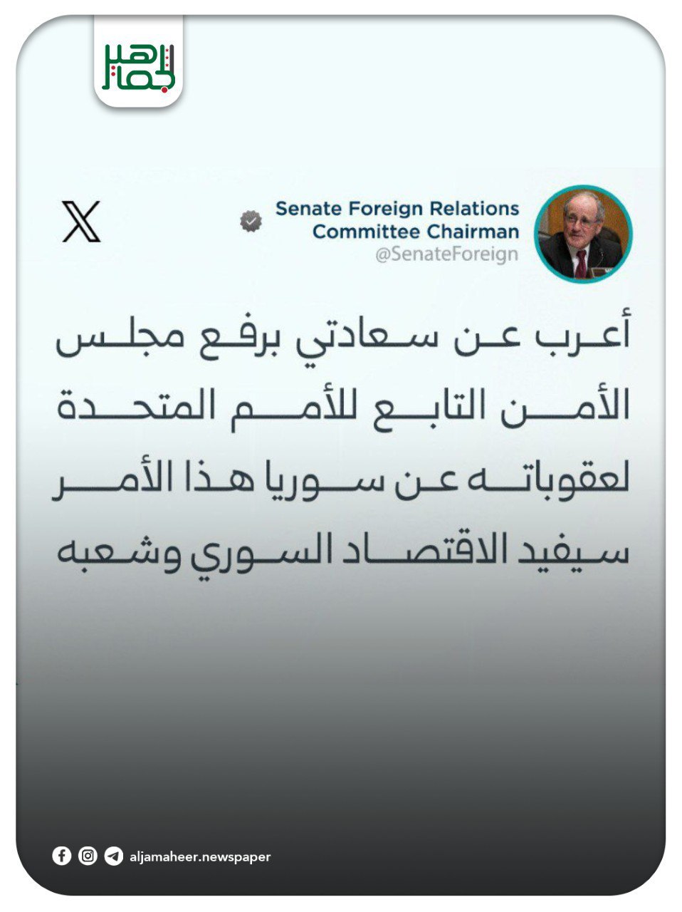 أعرب عن سعادتي برفع مجلس الأمن التابع للأمم المتحدة لعقوباته عن سورية هذا الأمر سيفيد الاقتصاد السوري وشعبه