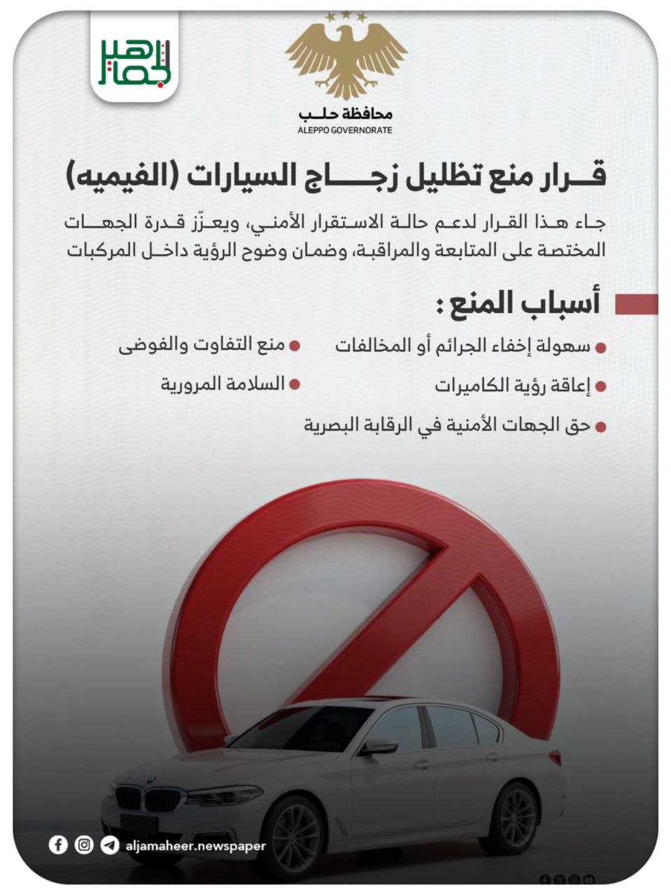 بدأت قوى الأمن الداخلي في حلب بتشديد إجراءات إزالة “الفيميه” عن زجاج السيارات، تنفيذاً لقرار يهدف لتعزيز الأمن العام ومنع الفوضى وضمان السلامة المرورية.