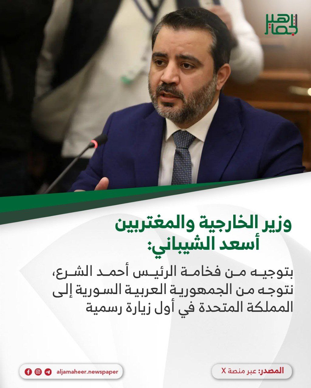 وزير الخارجية والمغتربين أسعد الشيباني عبر منصة “X أحدث الأخبار On نوفمبر 12, 2025 Share 📌بتوجيه من فخامة الرئيس أحمد الشرع، نتوجه من الجمهورية العربية السورية إلى المملكة المتحدة في أول زيارة رسمية. 📌نحمل آمال السوريين وطموحاتهم في بناء وطنٍ يحمي مستقبل أبنائنا والأجيال القادمة. 🔔 اشترك بقناة التيليجرام: https://t.me/jamaheer Share FacebookTwitterGoogle+ReddItWhatsAppPinterestالبريد الإلكتروني