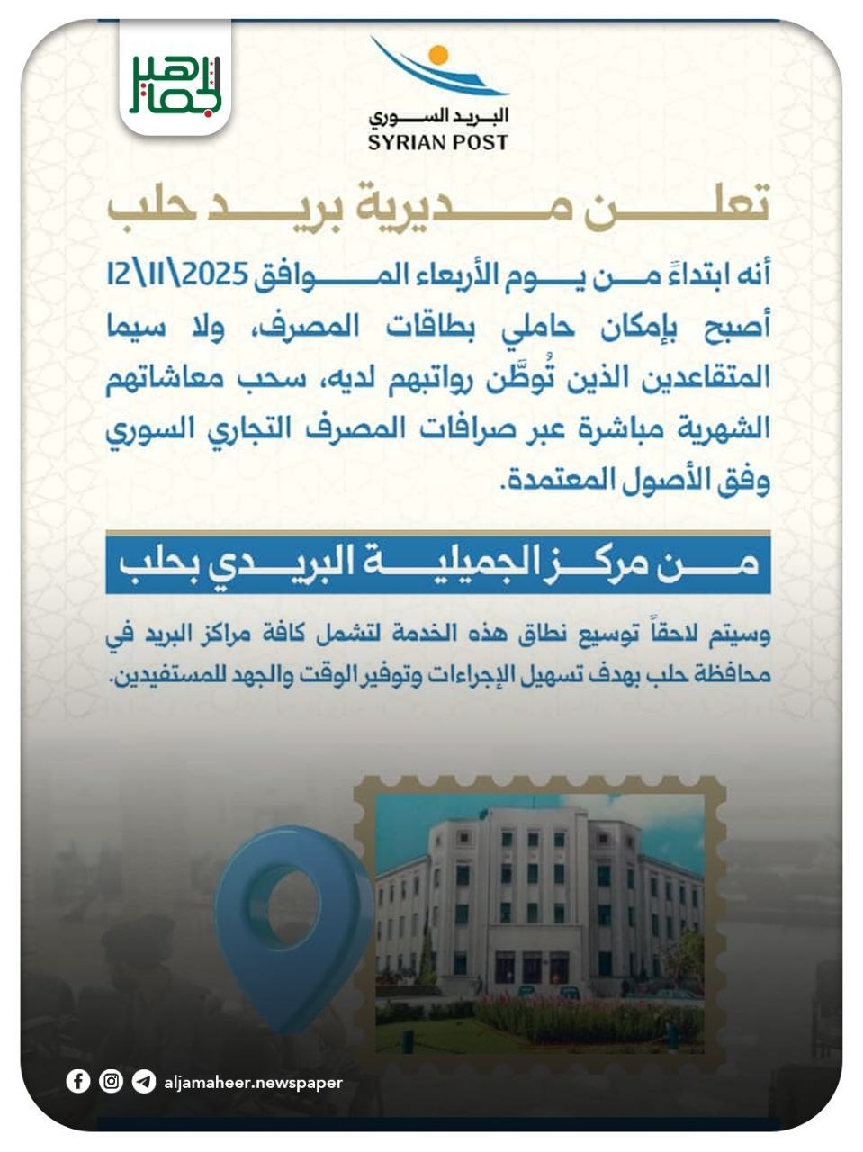 تعلن مديرية بريد حلب، ابتداءً من يوم الأربعاء الموافق 12/11/2025، بإمكان حاملي بطاقات المصرف ولاسيما المتقاعدين، سحب معاشاتهم الشهرية مباشرة عبر صرافات المصرف التجاري السوري، وسيتم التوسع لاحقاً لتشمل كافة مراكز البريد. أحدث الأخبارمحليات On نوفمبر 12, 2025 Share Share FacebookTwitterGoogle+ReddItWhatsAppPinterestالبريد الإلكتروني