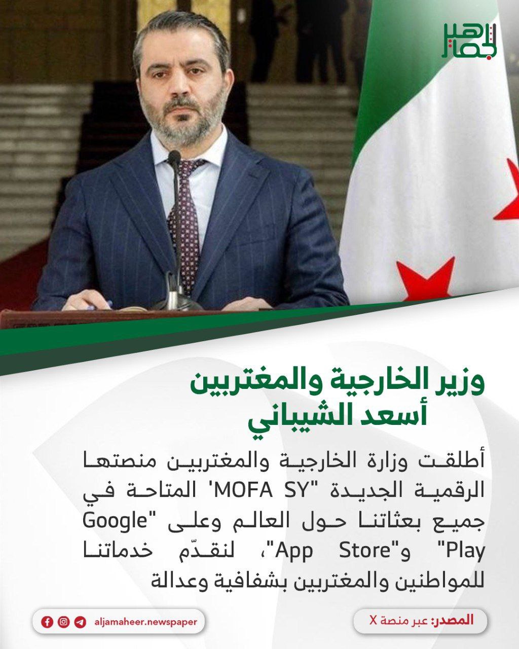 في إطار مساعينا نحو التحوّل الرقمي الشامل، أطلقت وزارة الخارجية والمغتربين منصتها الرقمية الجديدة “MOFA SY”، المتاحة في جميع بعثاتنا حول العالم وعلى “Google Play” و”App Store”، لنقدّم خدماتنا للمواطنين والمغتربين بشفافية وعدالة.