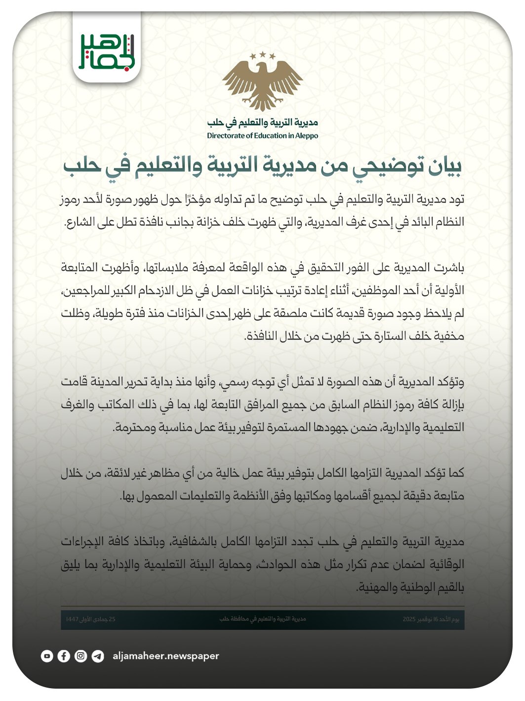 المديرية تشدّد على التزامها الكامل بالمتابعة الدقيقة لجميع أقسامها، واتخاذ إجراءات وقائية لضمان عدم تكرار مثل هذه الحوادث، وحماية البيئة التعليمية والإدارية وفق القيم الوطنية والمهنية.