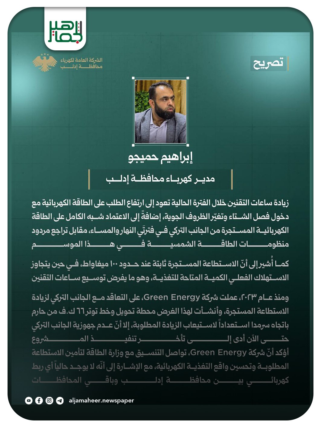 📌 الاعتماد شبه الكامل على الطاقة الكهربائية المستجرة من الجانب التركي في فترتي النهار والمساء، وتراجع مردود منظومات الطاقة الشمسية في هذا الموسم.