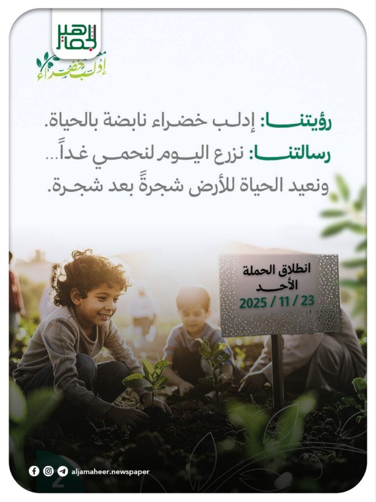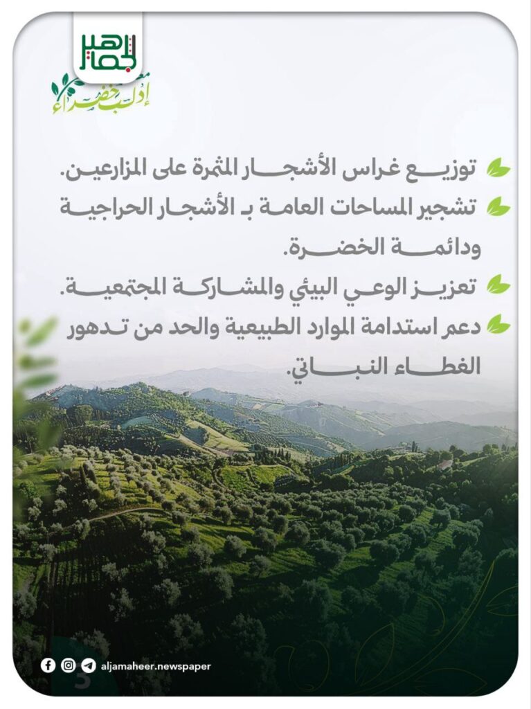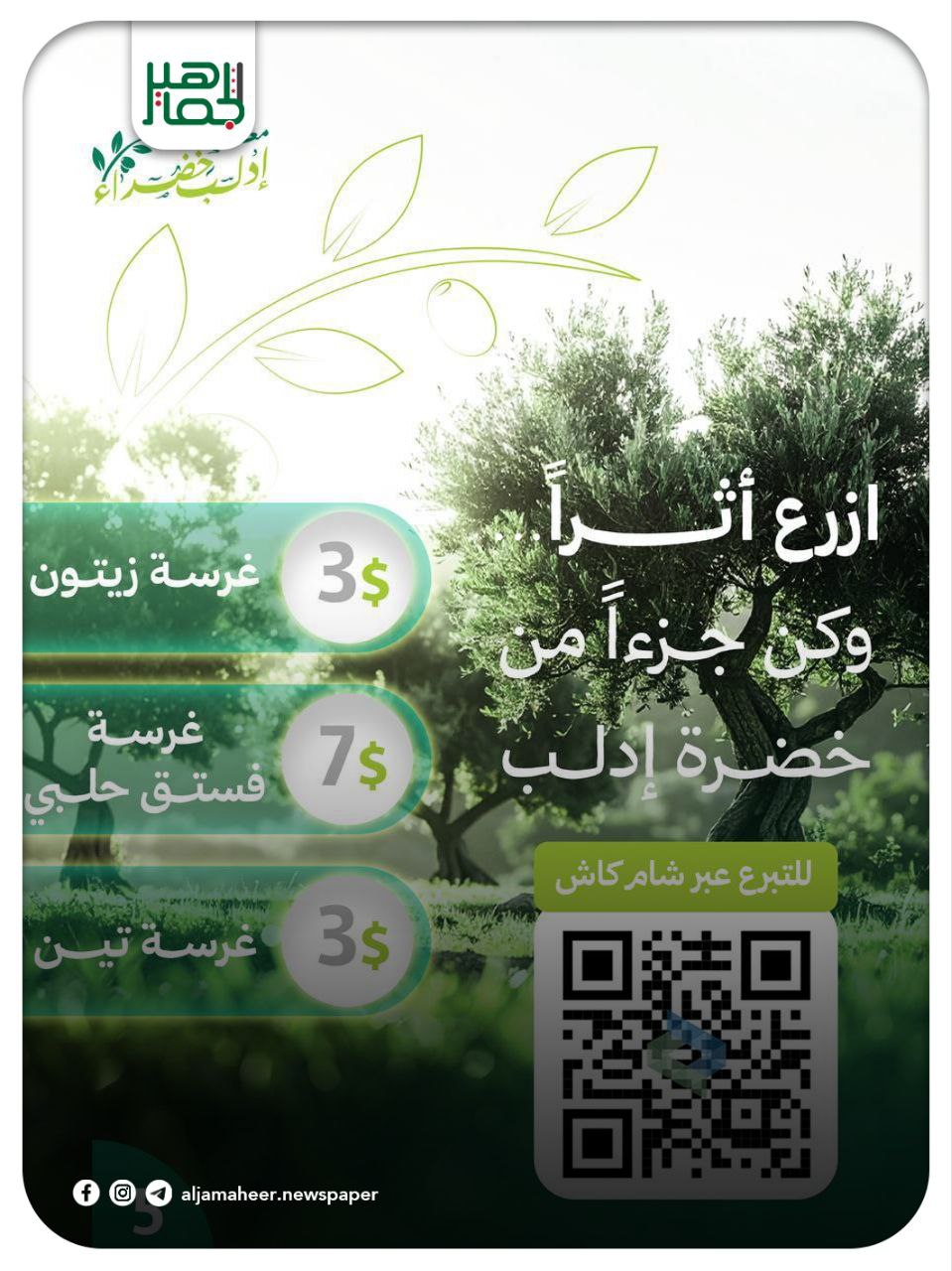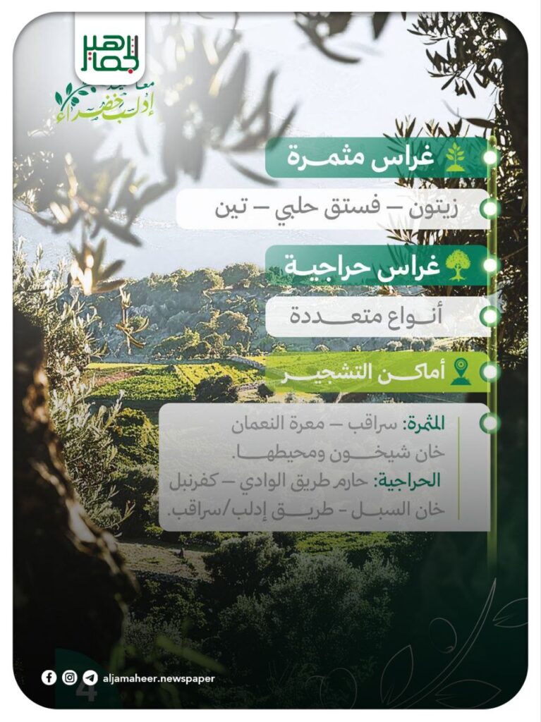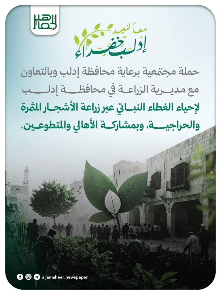 تنطلق يوم الأحد 23 تشرين الثاني 2025 الحملة المجتمعية لإحياء الغطاء النباتي في محافظة إدلب، عبر زراعة الأشجار المثمرة والحراجية بمشاركة الأهالي والمتطوعين خدمي On نوفمبر 17, 2025 Share ازرع أثراً وكن جزءاً من خُضرة إدلب. 🔔 اشترك بقناة التيليجرام: https://t.me/jamaheer Share FacebookTwitterGoogle+ReddItWhatsAppPinterestالبريد الإلكتروني