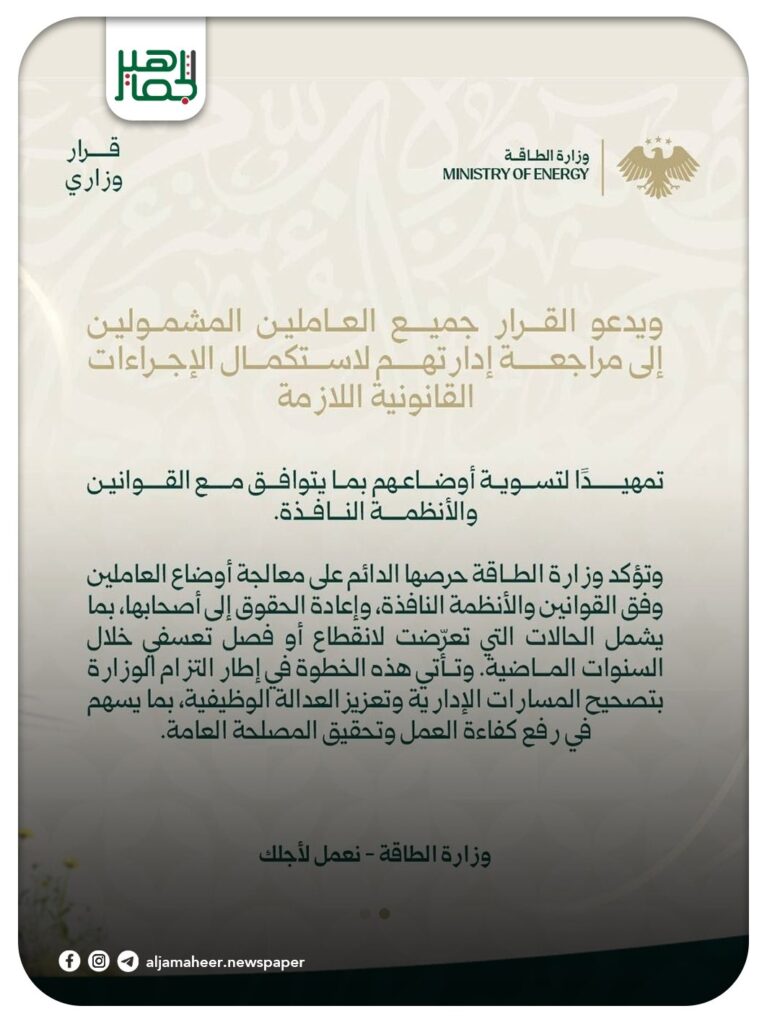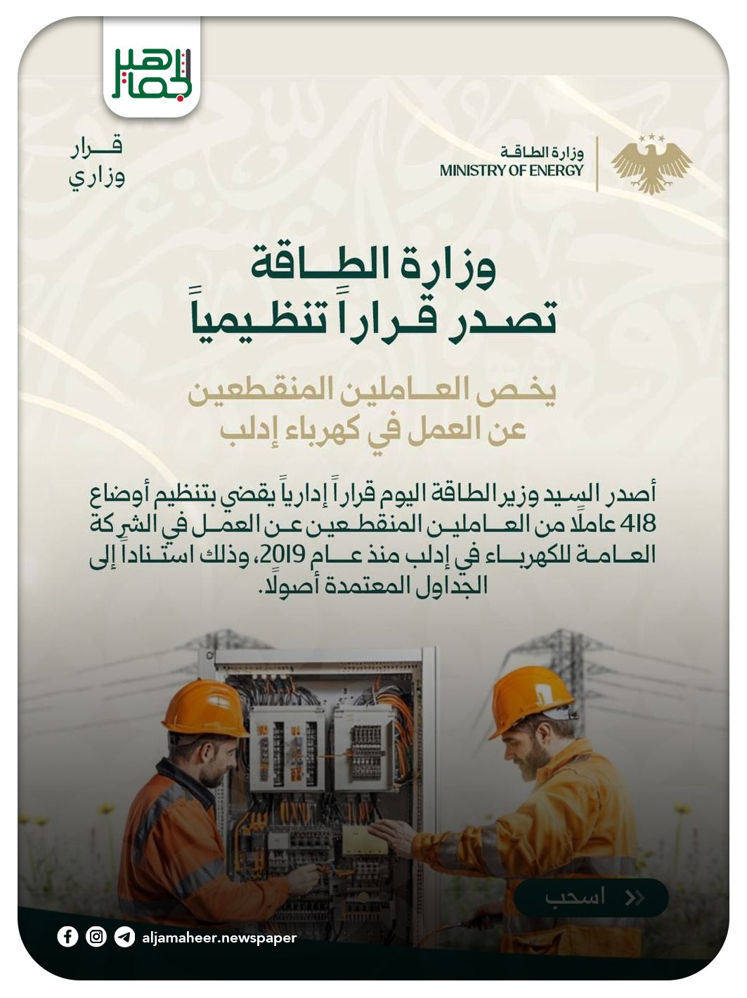 وزارة الطاقة تصدر قراراً تنظيمياً يخص العاملين المنقطعين عن العمل في كهرباء إدلب خدمي Last updated نوفمبر 17, 2025 Share أصدر السيد وزير الطاقة اليوم قراراً إدارياً يقضي بتنظيم أوضاع 418 عاملاً من العاملين المنقطعين عن العمل في الشركة العامة للكهرباء في إدلب منذ عام 2019. 🔔 اشترك بقناة التيليجرام: https://t.me/jamaheer Share FacebookTwitterGoogle+ReddItWhatsAppPinterestالبريد الإلكتروني