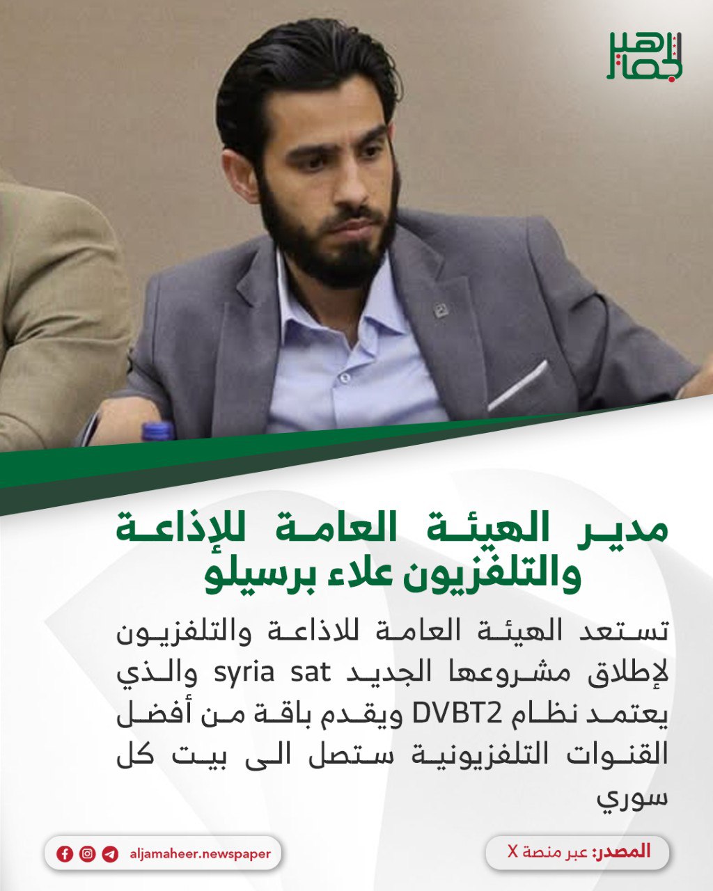 📌في إطار سعيها لتقديم محتوى آمن ولائق وانطلاقاً من إيمانها العميق بضرورة مواكبة التطور التقني المتسارع تستعد الهيئة العامة للإذاعة والتلفزيون لإطلاق مشروعها الجديد “Syria SAT” والذي يعتمد نظام “DVBT2” ويقدم باقة من أفضل القنوات التلفزيونية ستصل إلى بيت كل سوري